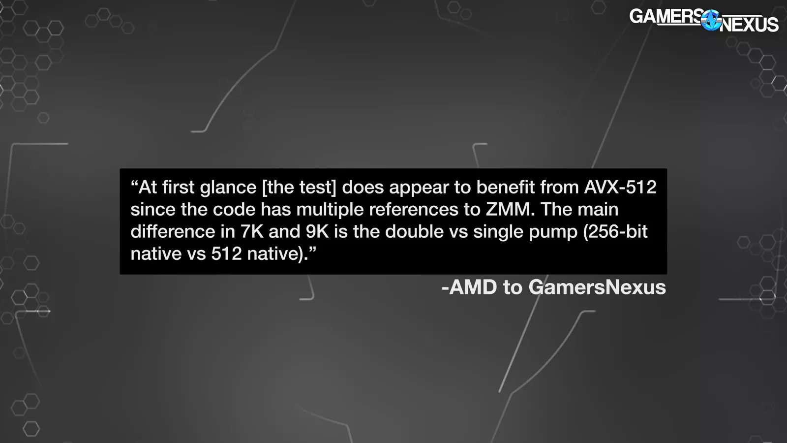 “At first glance [the test] does appear to benefit from AVX-512 since the code has multiple references to ZMM. The main difference in 7K and 9K is the double vs single pump (256-bit native vs 512 native).”