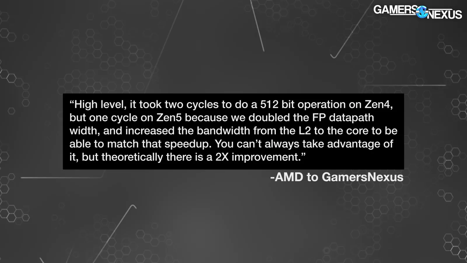“High level, it took two cycles to do a 512 bit operation on Zen4, but one cycle on Zen5 because we doubled the FP datapath width, and increased the bandwidth from the L2 to the core to be able to match that speedup. You can't always take advantage of it, but theoretically there is a 2X improvement.”