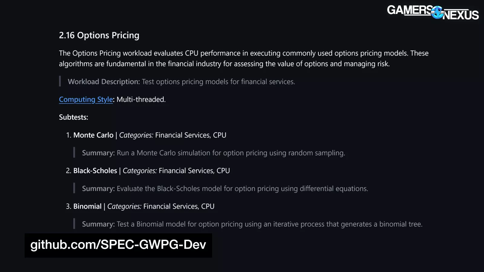 The first is Options Pricing. The website says that this runs Monte Carlo probabilistic simulations for financial uncertainty, Black-Scholes pricing models for theoretical value, and binomial options pricing. We are not experts in how these are used, but those of you in our audience who are experts have repeatedly expressed an appreciation for this test.