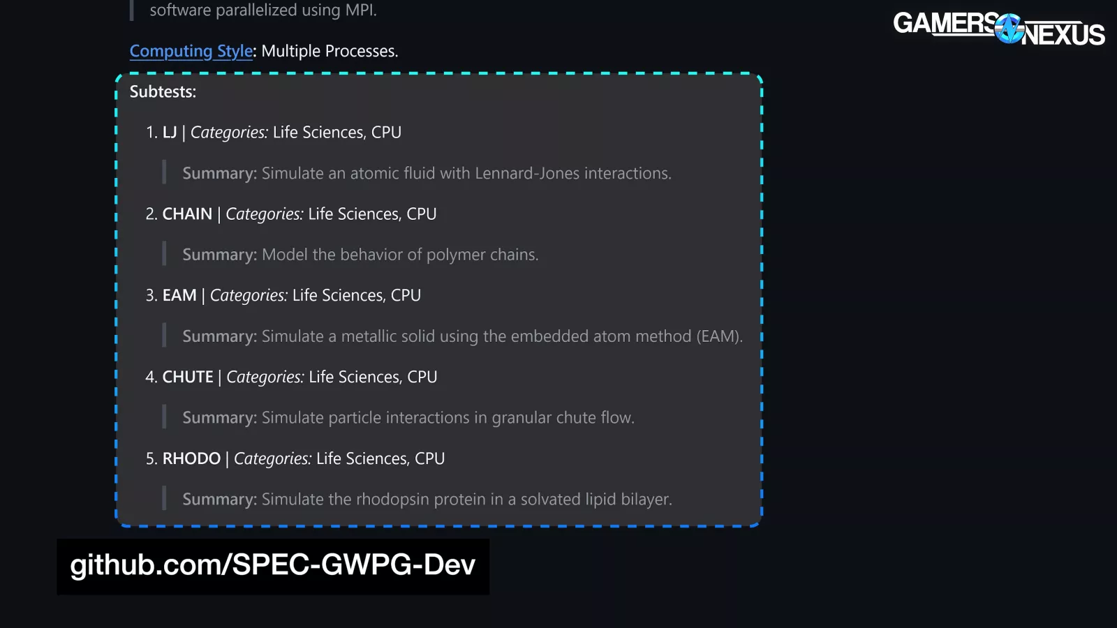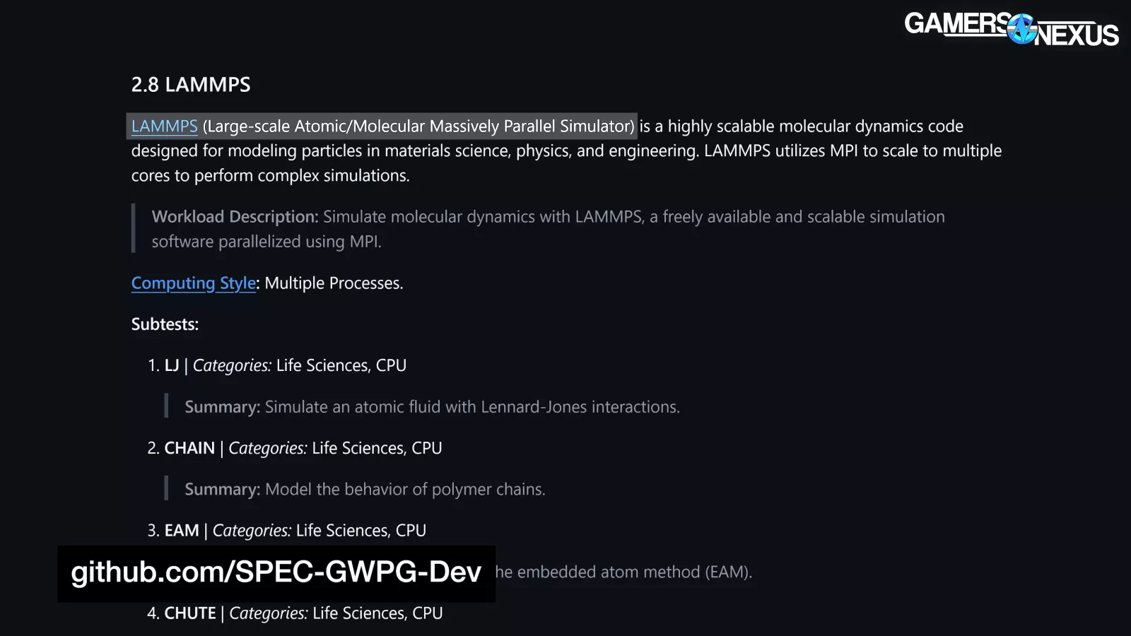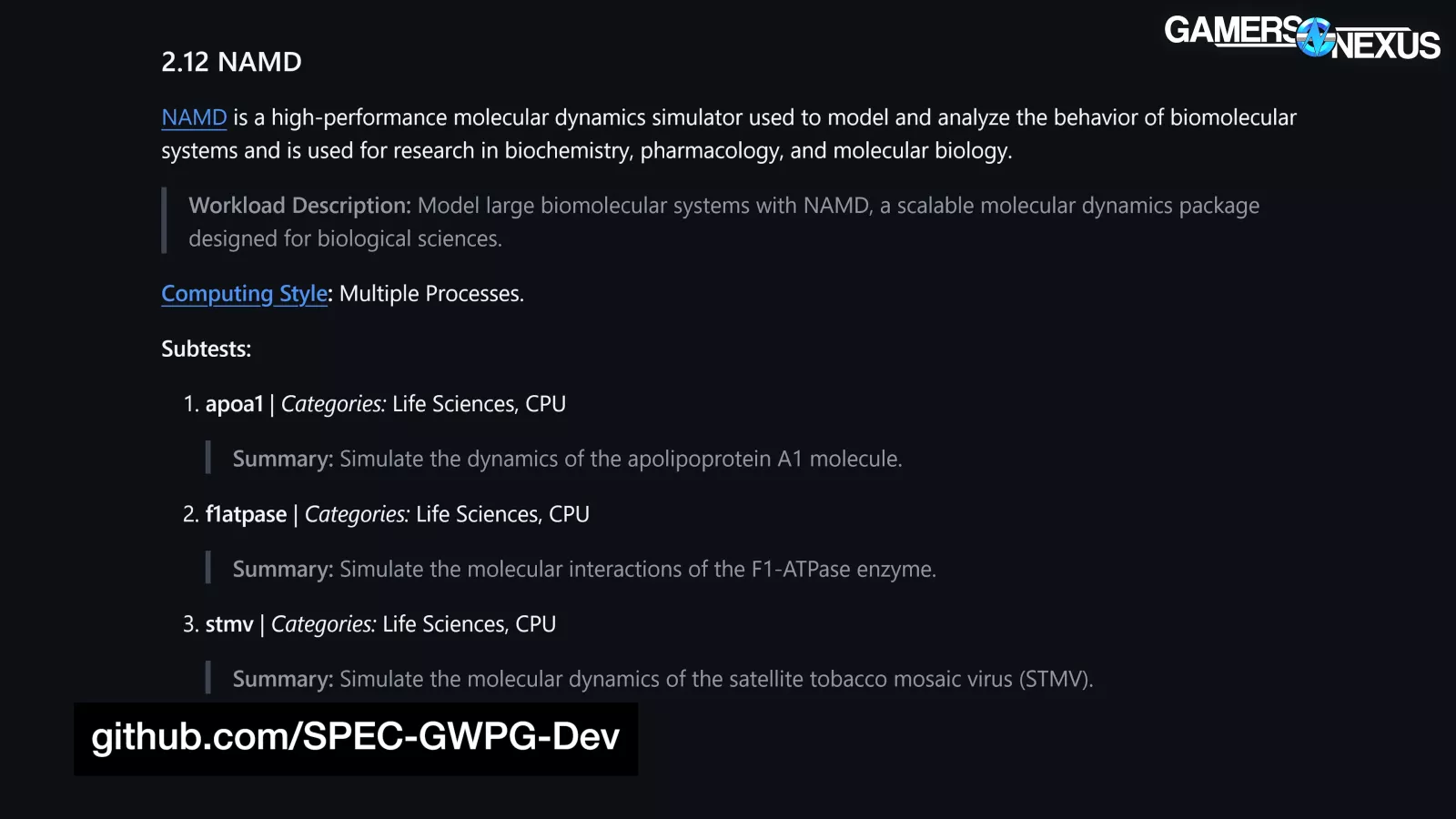 NAMD is next, another test our audience liked before. This is a molecular dynamics simulator for modeling “behavior of biomolecular systems,” with Spec saying that it is “used for research in biochemistry, pharmacology, and molecular biology.”