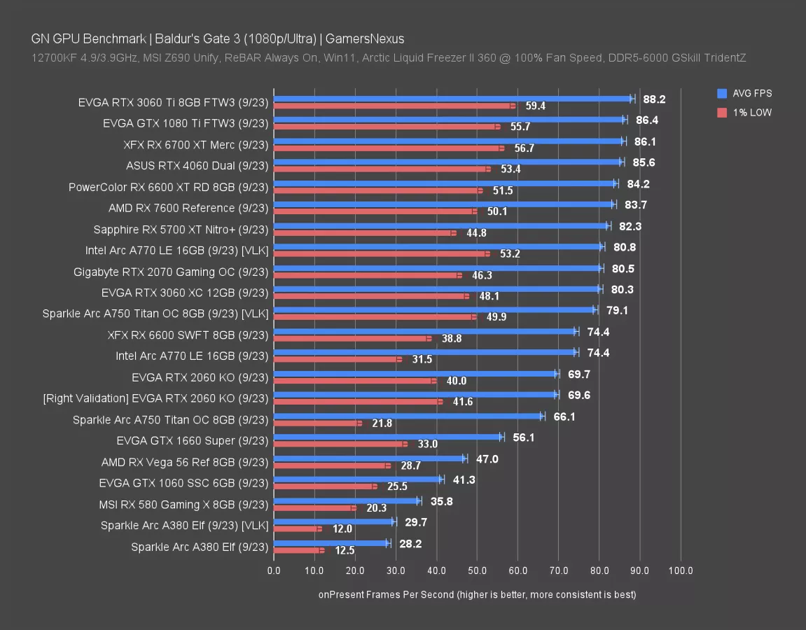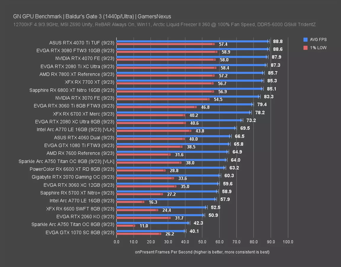 Even the RTX 3060 Ti manages 80FPS AVG here, which is more than high enough for a game like Baldur’s Gate. Turning our attention to lower-end cards, the floor seems to be about the GTX 1070 (for what we tested) if your target is 40 FPS or better. By modern standards, that’s a low floor. Any upper-mid-range or high-end card released in the last 8 years or so should have no trouble playing this game at a good framerate even at 1440p/Ultra.