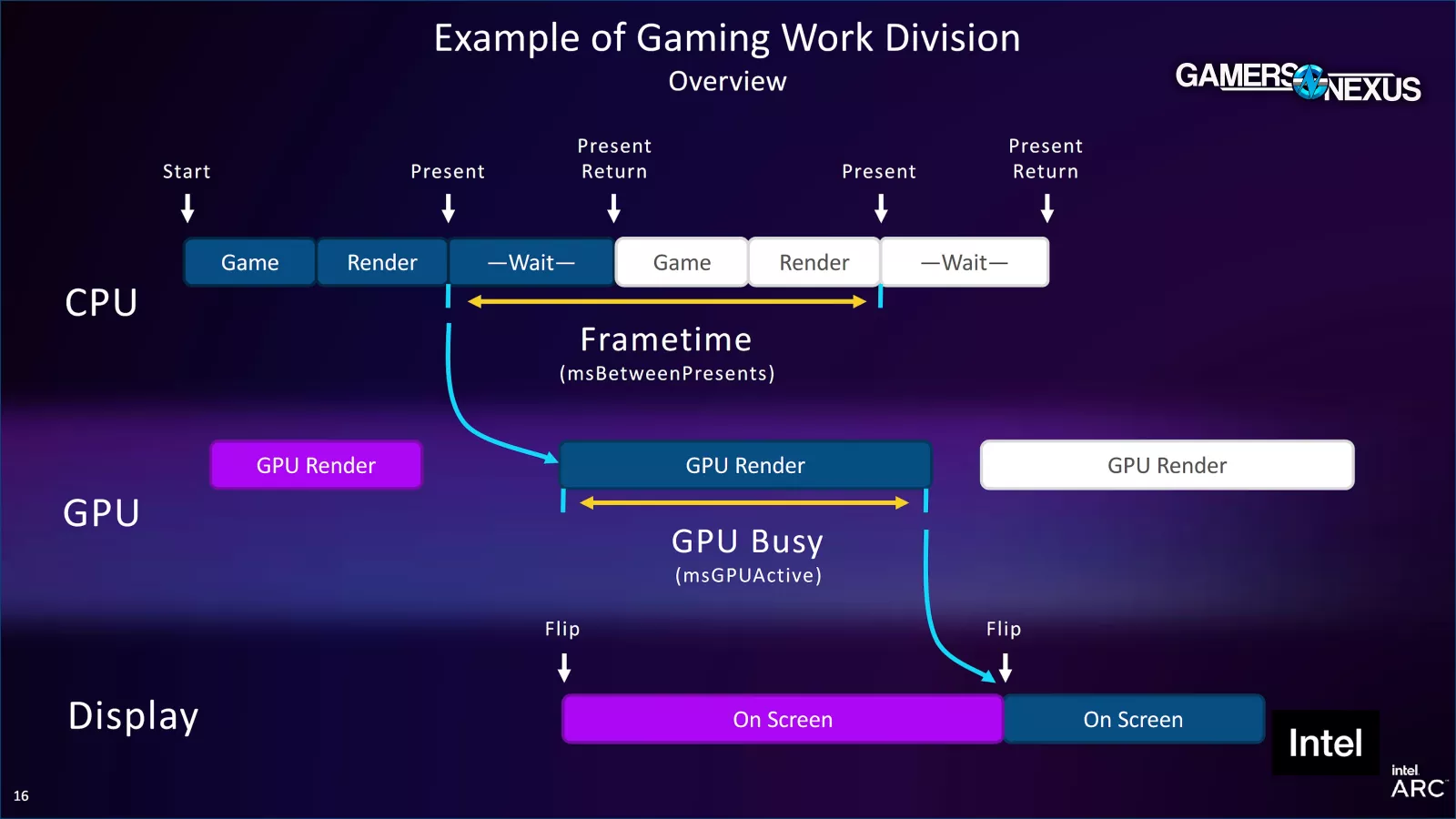 GPU Busy effectively looks at the amount of time spent in each frame by the GPU doing meaningful work. So the closer the GPU busy number is in frametime to the actual total composite frametime number, the more GPU utilization you’ll have. If they are distant from each other, for example, if GPU busy is down at 1 millisecond but the frametime is 7 milliseconds, you've got 6ms +/- where the GPU isn't really doing anything. In that case, maybe you're CPU-bound, maybe you're memory-bound, or there's a game, driver, or framerate cap, or something like that. It's only the beginning for GPU Busy. The hope is that this will expand to allow us to see CPU Busy or maybe memory or cache back pressure on the GPU if we're running out of memory on the card. Maybe these metrics will one day be able to tell us that. It's just a matter of if it gets turned on eventually.