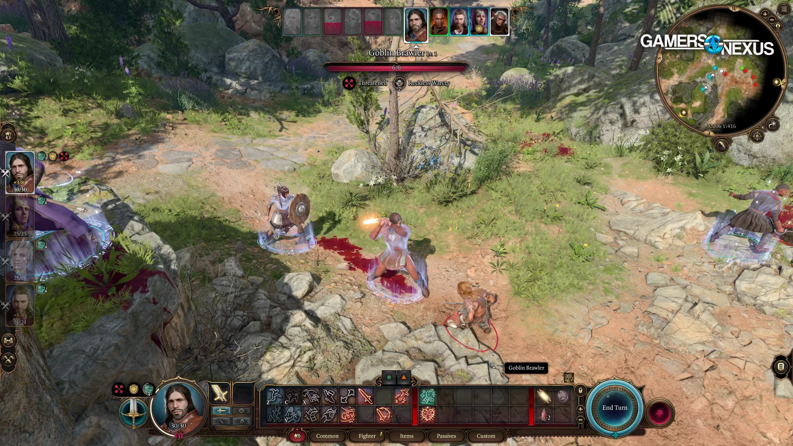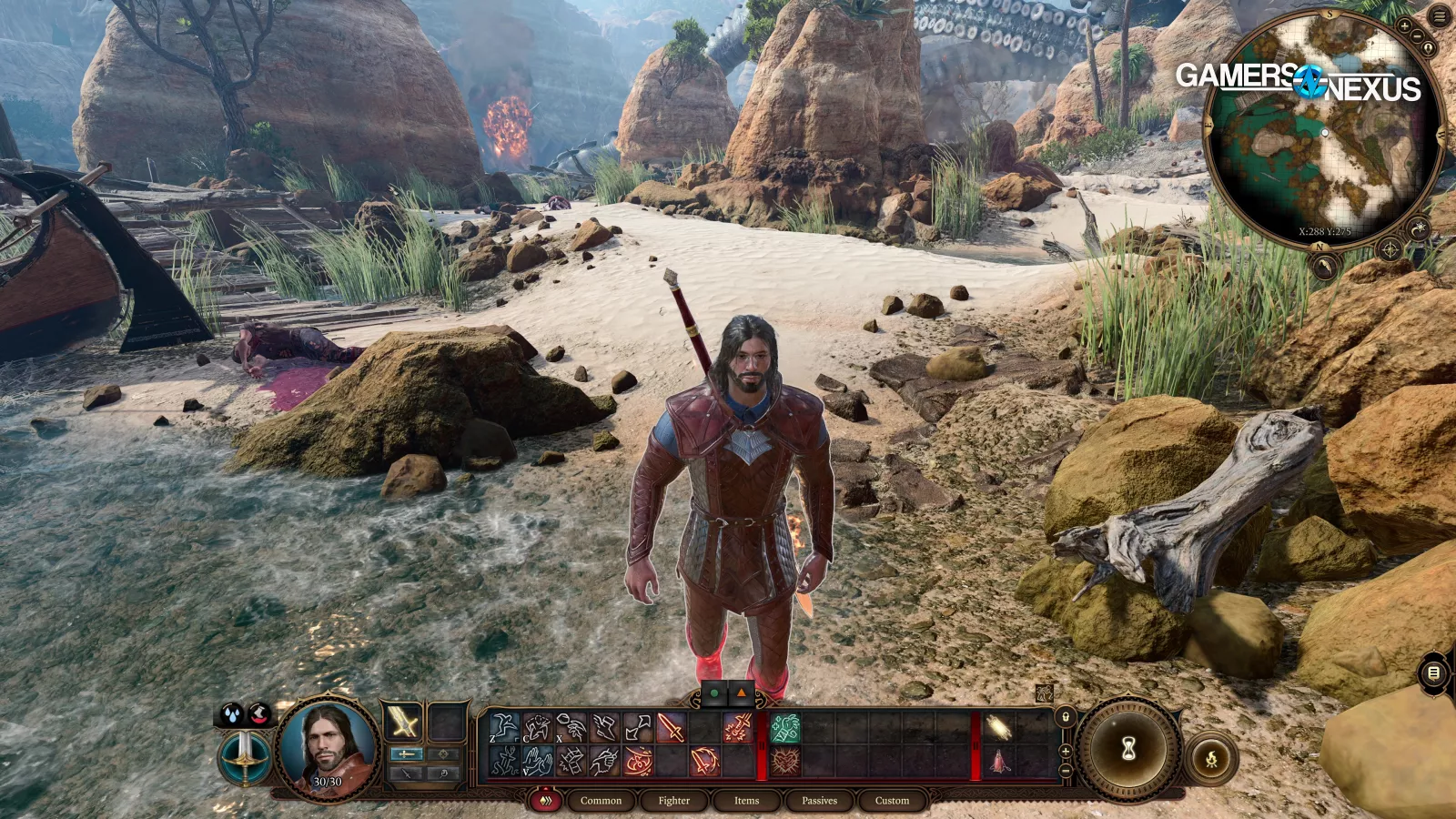 Wilderness combat had us in the 70s, also higher than Baldur’s Gate itself. Zooming-in in the wilderness dropped our framerate by over 10FPS, something we couldn’t replicate in Baldur’s Gate city. It was much more consistent there. We think this is just related to the proximity of other character models to the camera, plus the wilderness zoom had a longer sightline before occlusion might have culled assets.