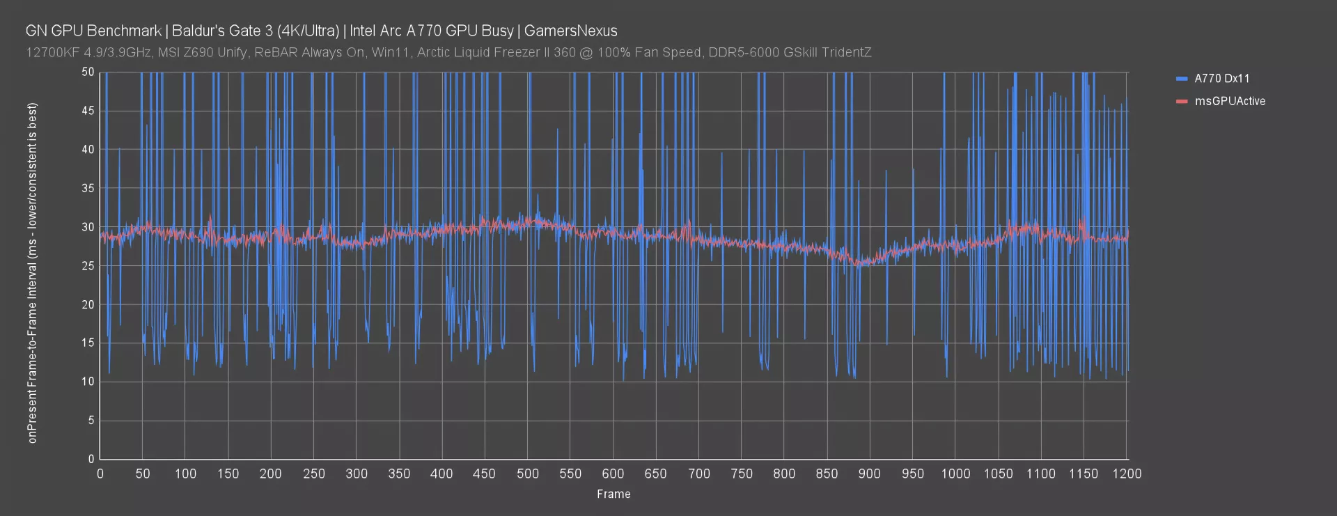 GPU Busy is an interesting metric here. This chart shows the DX11 frametime plotted against the GPU Busy time for Intel Arc. We’ve zoomed it in, so it’s truncated the scale. You can see that despite the frames sometimes taking 120ms to complete the frame, the GPU busy time is often around 30ms. That tells us that, for 30ms out of 120ms, the GPU is the busy part. We also know we’re not CPU-bound, and so we’re left with a few possible assumptions. Our strongest one is that it might be that we’re getting sent to system memory due to a GPU VRAM utilization issue, likely caused by drivers.