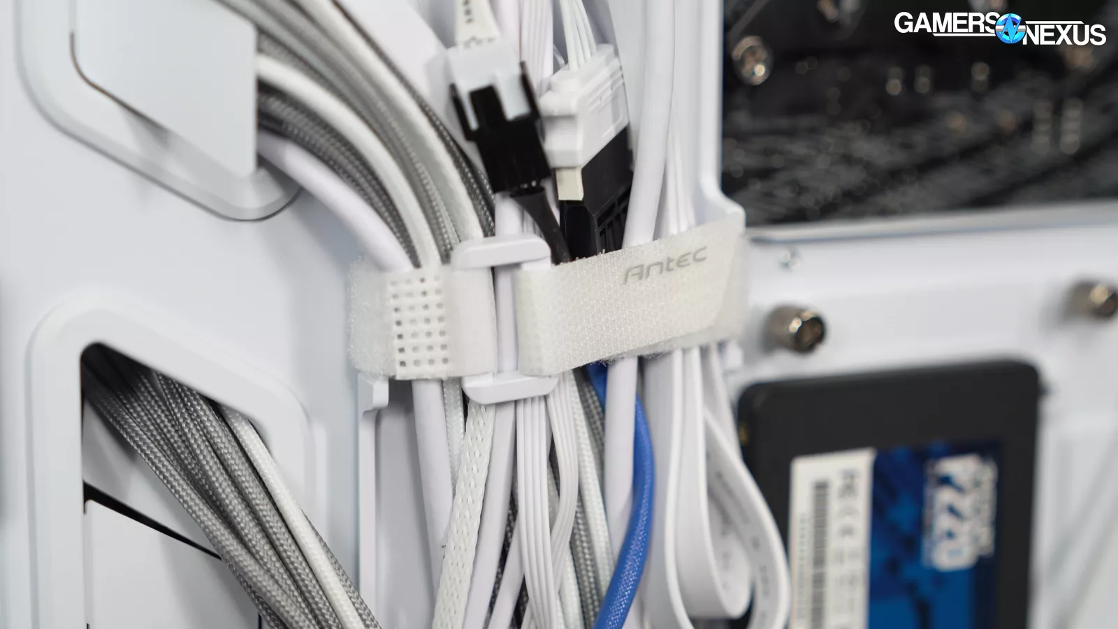 Using the iShift mount means committing to keeping the cable slack behind the motherboard tray, which Antec’s velcro straps enable. Cable management is more visually important on this case than some others due to the ventilation on all sides of the shroud. Cable cutouts are standard overall, with the exception of a relatively small CPU power cutout up top.