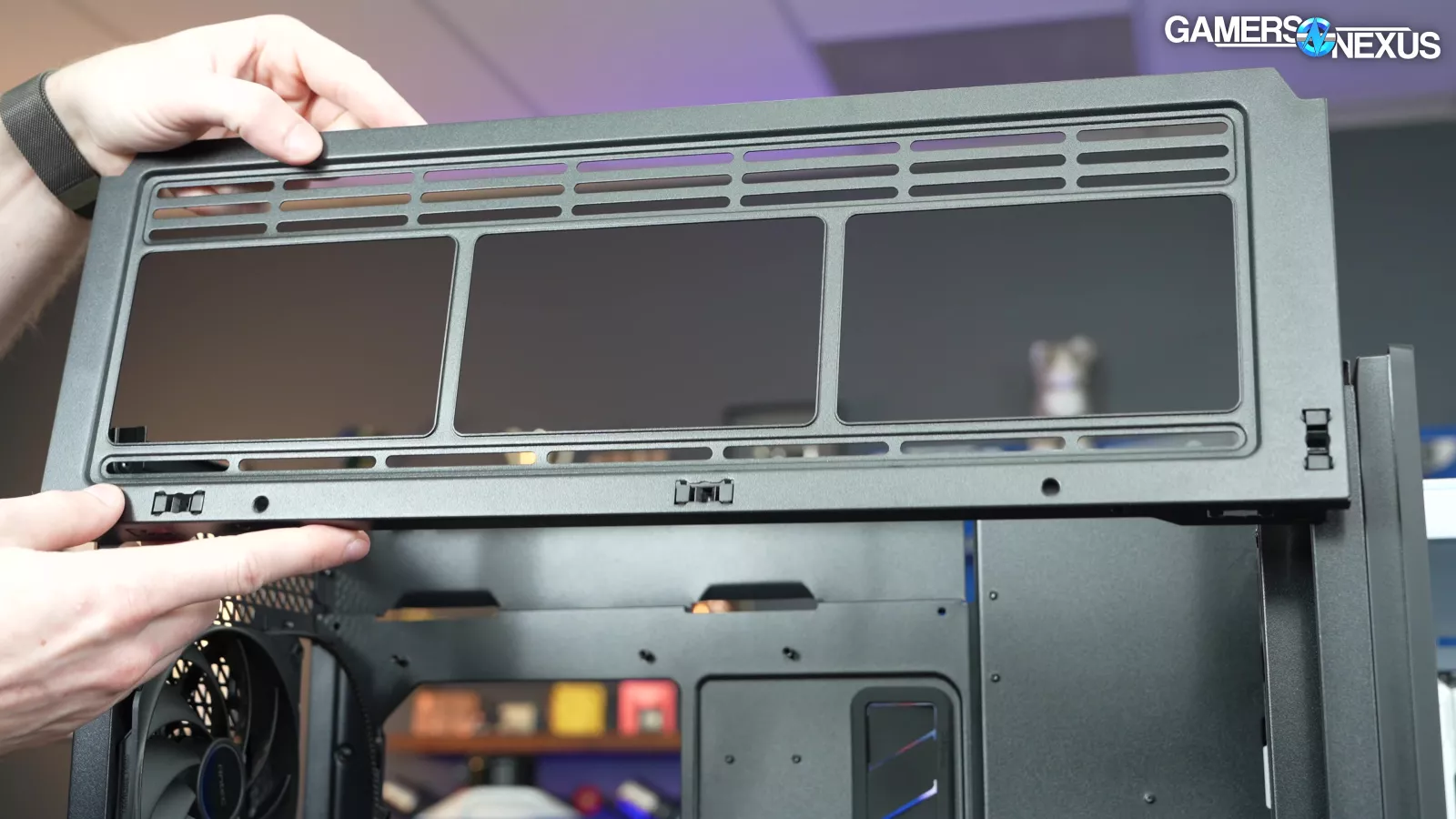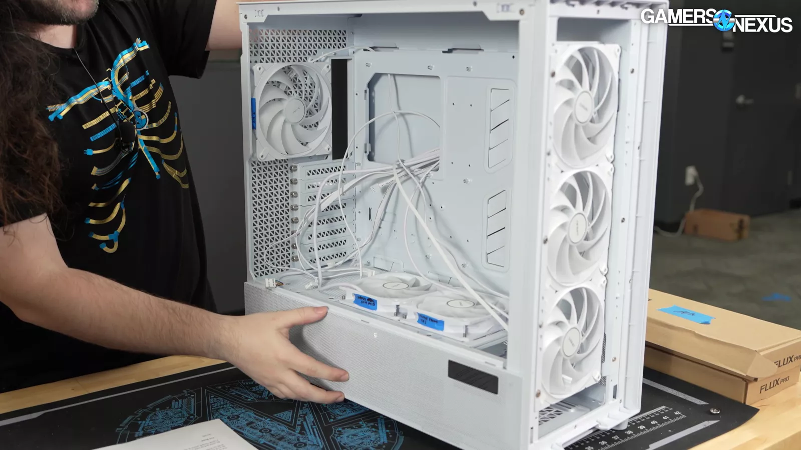 The goal is that modular connections become easier to access and route. There are some situations where this doesn't really help, like the Corsair 6500 series, but using either a side interface PSU or the iShift mount specifically with the Flux platform is a good combination. Moving cables out of the way theoretically allows a better airflow path in some places. The Flux Pro’s wide vents were clearly designed to take advantage of this. We're excited about the solution: it reminds us of Lian Li cases like the Lancool III, but all-in on the shroud-top cooling concept rather than just including it as an option. Of course, airflow would be even better without any bottom shroud at all, but that's what the C8 is for. Lian Li’s new 207 from Computex also looks promising here.