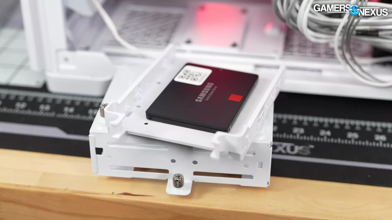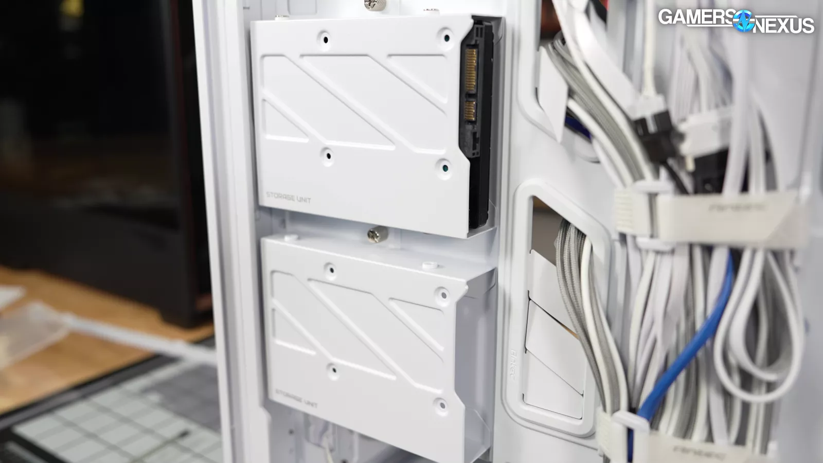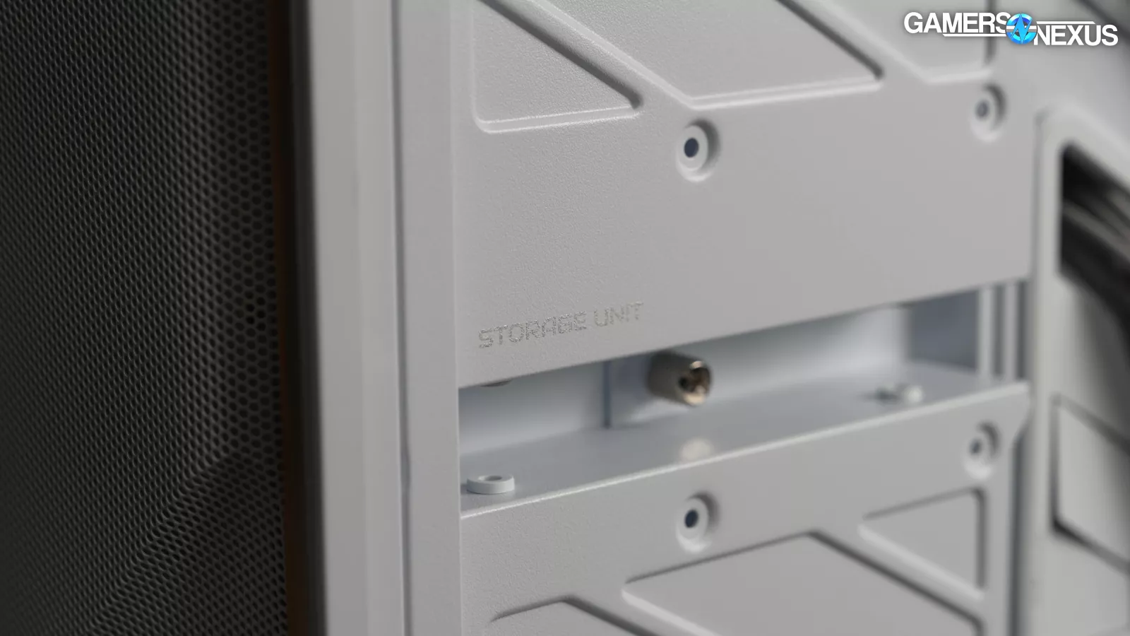 For drives: There are 2x 2.5" mounts behind the motherboard tray, 2x 2.5"/3.5" mounts towards the front of the case, and a cage under the shroud that can hold one more 2.5"/3.5" drive inside and another on top. The hardware is freely repositionable for this: We recommend just pulling the whole assembly out and relying on the other mounts if you don’t need that many drives, as it frees up several more fan slots, removes an airflow obstruction, and the remaining two 3.5" mounting locations have rubber vibration dampers.