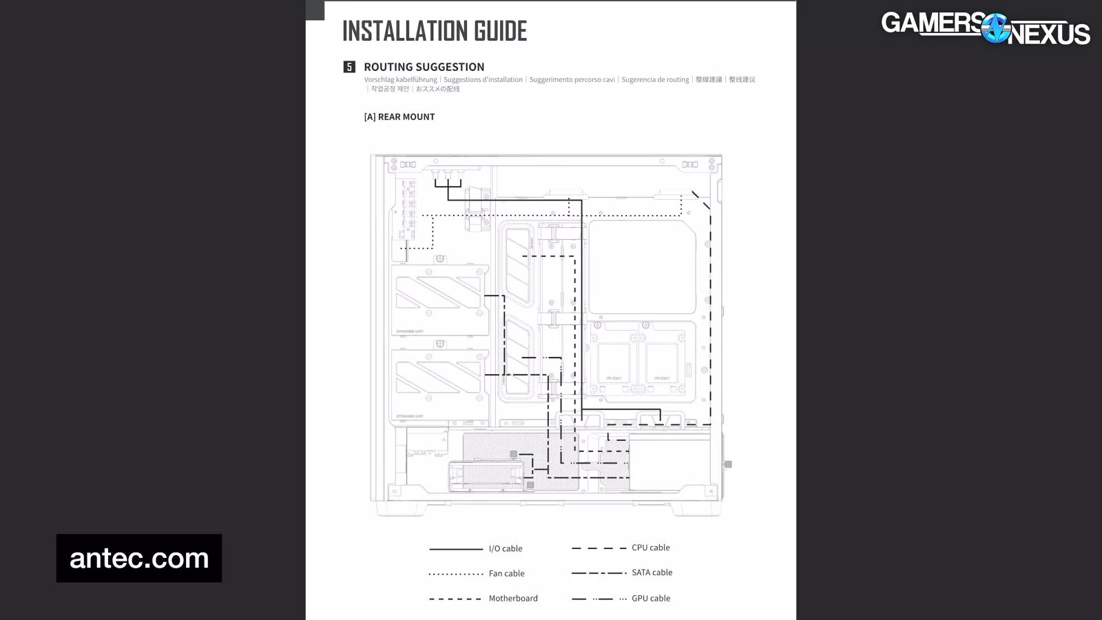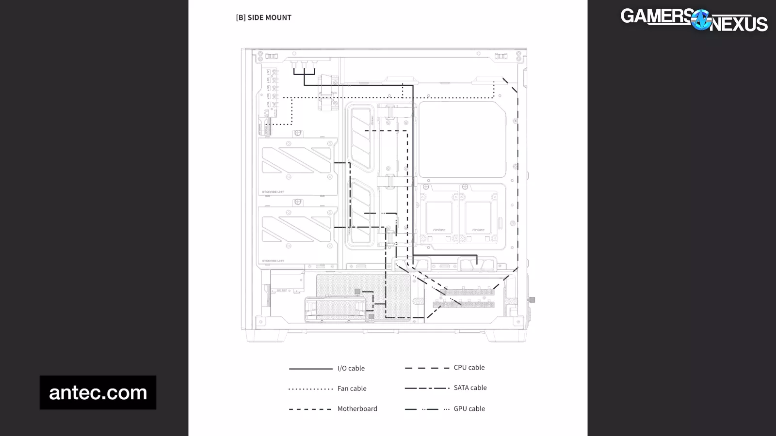 Using the iShift mount makes connections accessible and benefits EPS12V routing, but we wouldn't go as far as saying that "routing has never been easier." Antec included a card in the accessory kit that describes four types of PSU layouts and the correct way to install each of them with the PSU extension cable. Full credit to Antec for including good instructions, but it isn't "easier." On that subject, we tried to follow the cable routing guide in the manual when connecting our 12VHPWR cable, but the diagram just isn't readable in 2D.