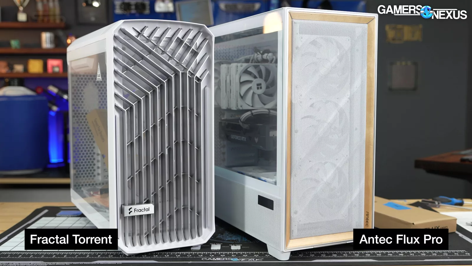 The Antec Flux Pro’s looks are subjective. We think it looks good -- or at least “standard.” It's well built overall, and it has better overall thermals than anything we've tested recently. Its main downside is that it has an MSRP of $180-$185, and there are some strong competitors at that price. Fractal Design's North XL carried a launch MSRP of $180, and at that price we'd say the Flux Pro wins, but the North XL is on sale (as of this writing) for as low as $130 for the top-performing mesh sided SKU. The recently released NZXT H7 Flow (not to be confused with the NZXT H7 Flow) has a similar focus on bottom intake GPU cooling for as low as $130 MSRP, but it only comes with three fans and again, we haven't tested it. The 7000D is too expensive to directly compare. The Fractal Torrent remains a direct thermal competitor and, when it’s on sale, should remain on shortlists -- though it is an older case now, for those who care about that.