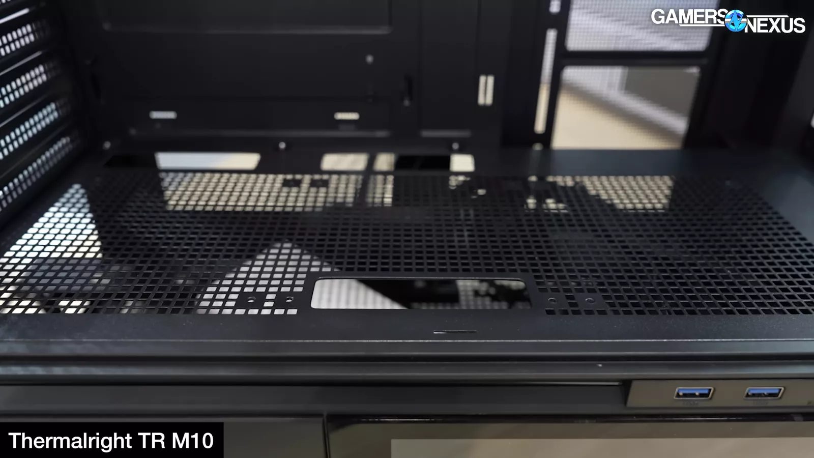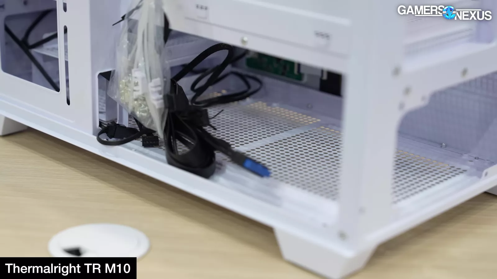 The case has good cable management depth and simple cable-management passthroughs without BTF support. It also has heavily ventilated panels everywhere. The TR M10 fits 3x120mm side-mounted fans for intake and can technically fit fans at the top of the power-supply shroud. This is made somewhat more viable, although distance is a challenge, by all of the holes punched through the floor of the case and even the drive cages.