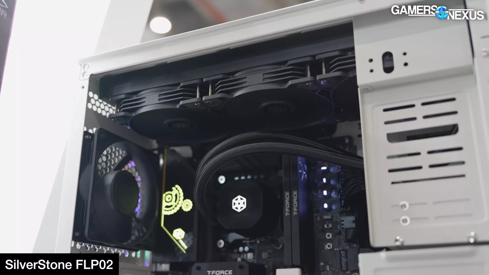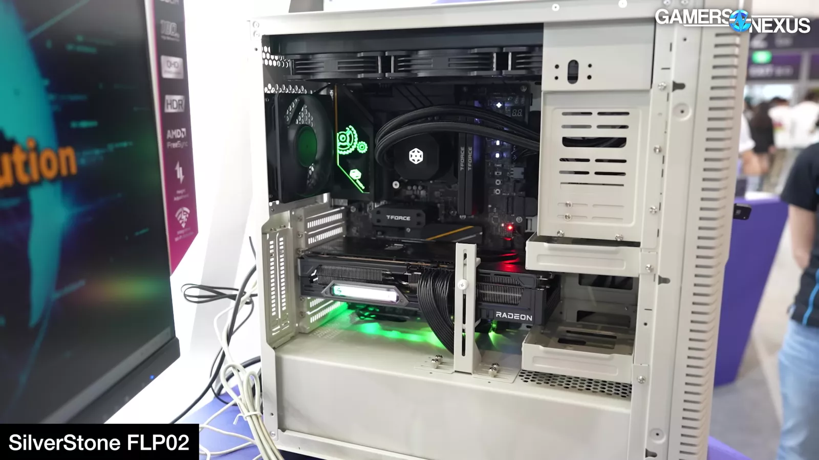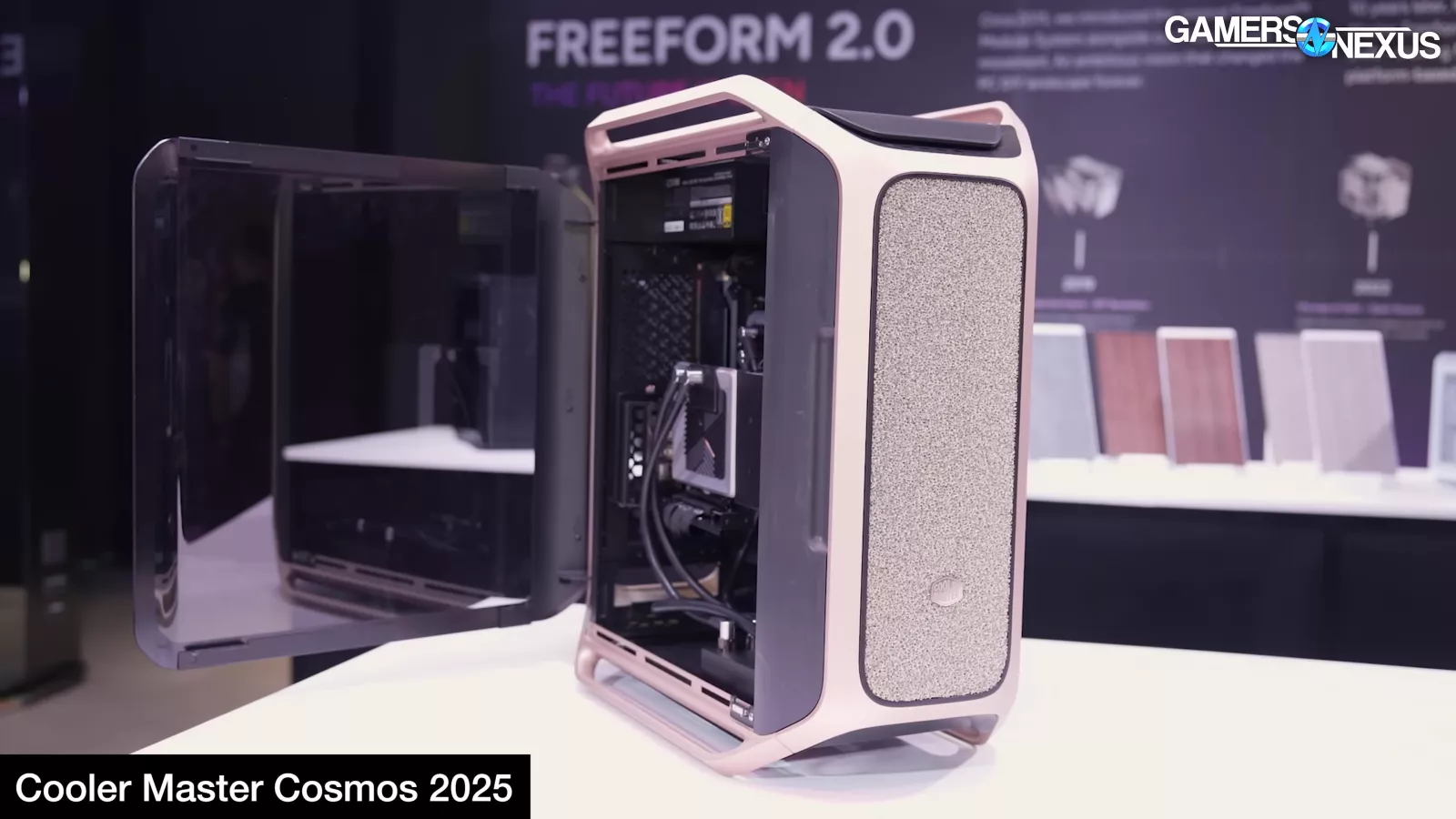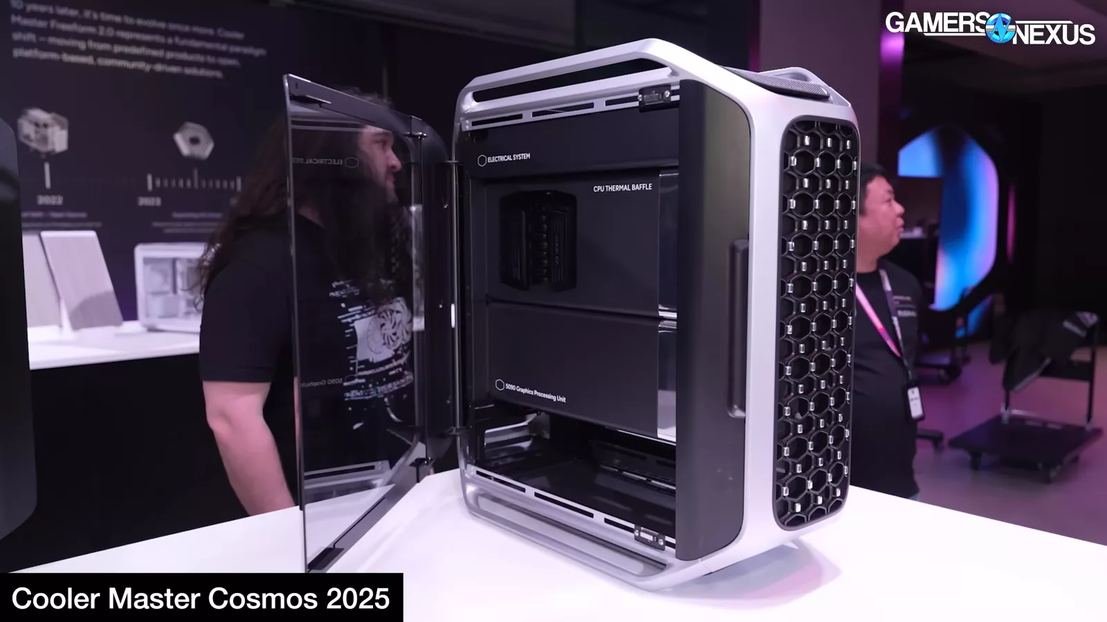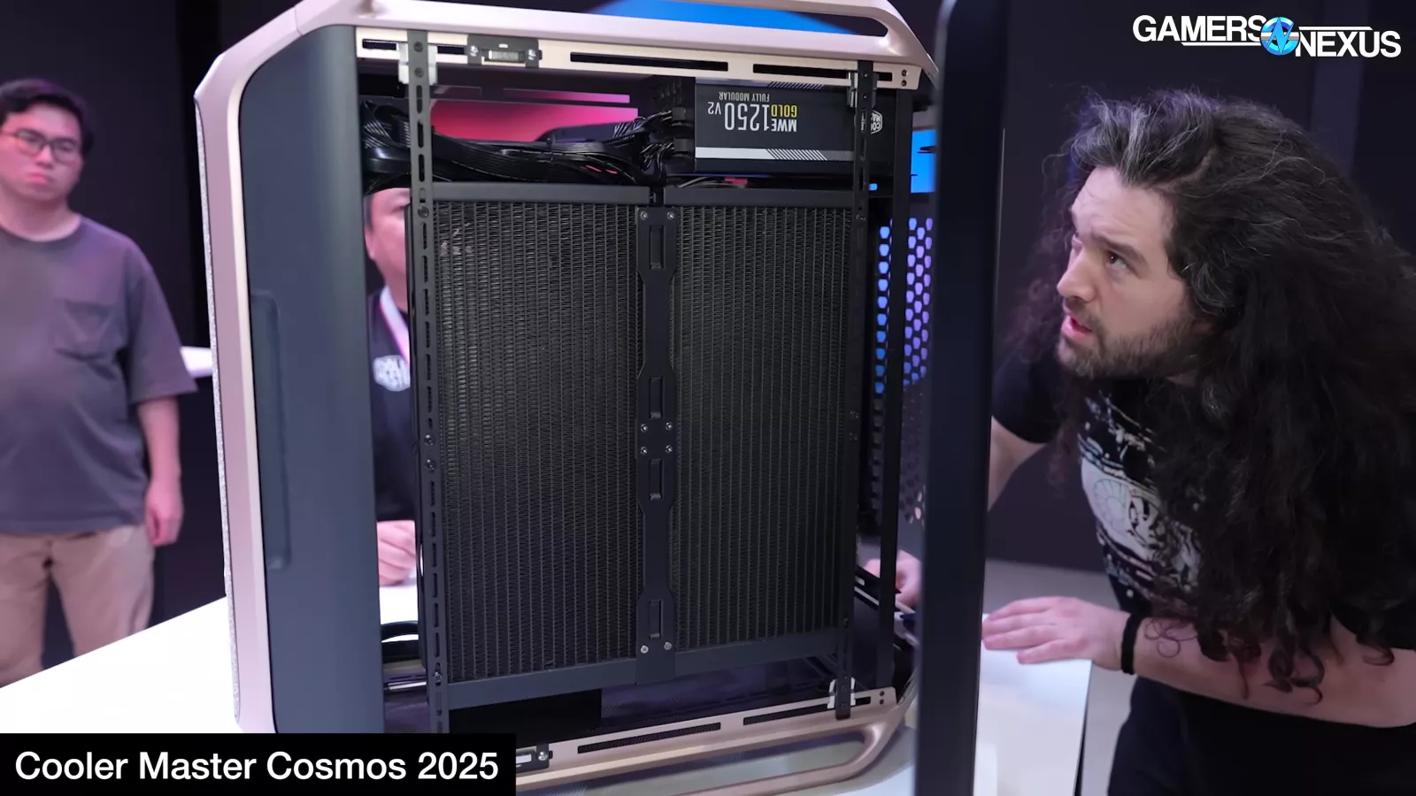 Cooler Master also debuted its new Cosmos cases, including a special edition variation with the NVIDIA DGX style front panel and another with ductwork for air cooling. We are currently critical of the special edition’s liquid cooling configuration and question how well it’ll work, though the size of the radiator should brute force performance (since it’s using 4x 180mm fans). It’s just that they’re blowing straight into a motherboard and wall.