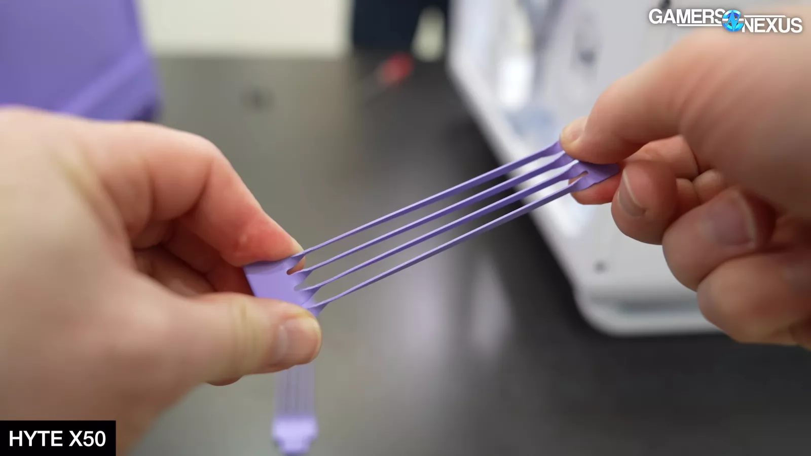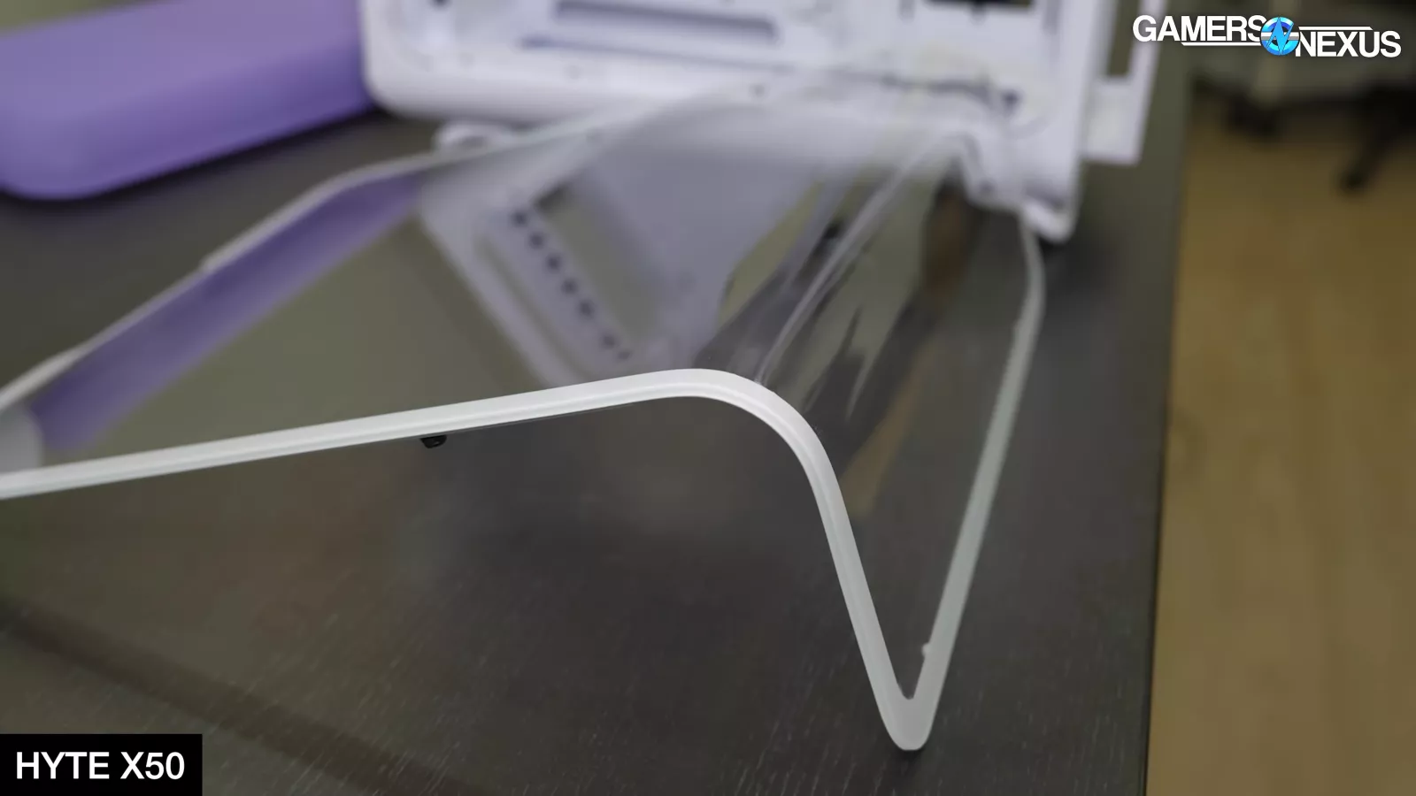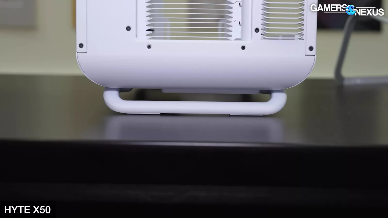 Hyte has a few styles of feet for the X50, including what the company refers to as “paws” (shown as the rounded feet) on some color models, with bars for models like the white case.