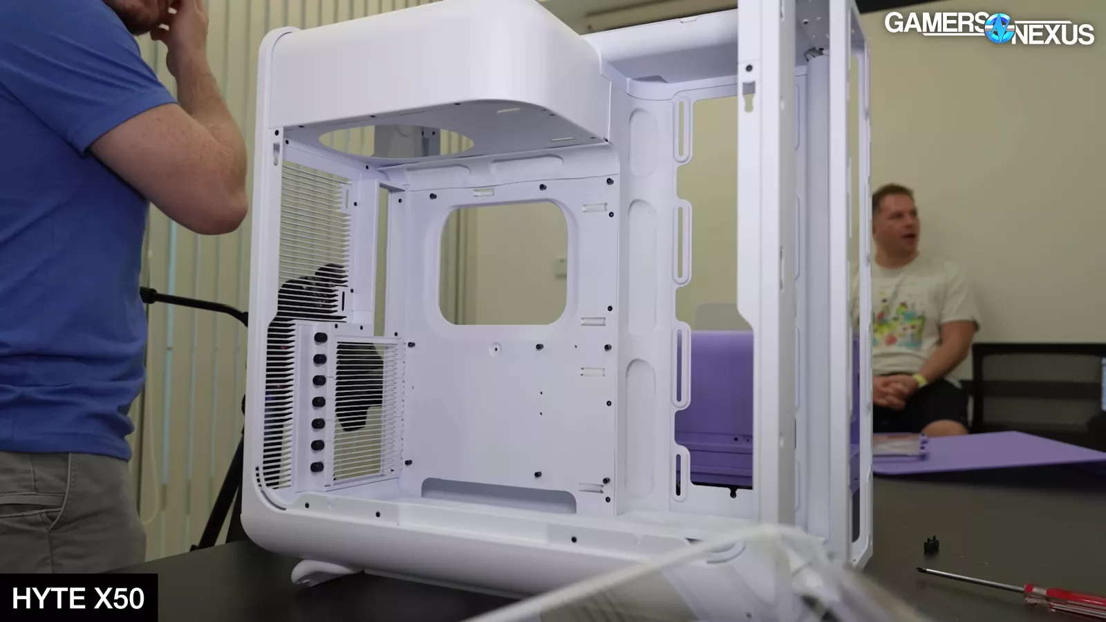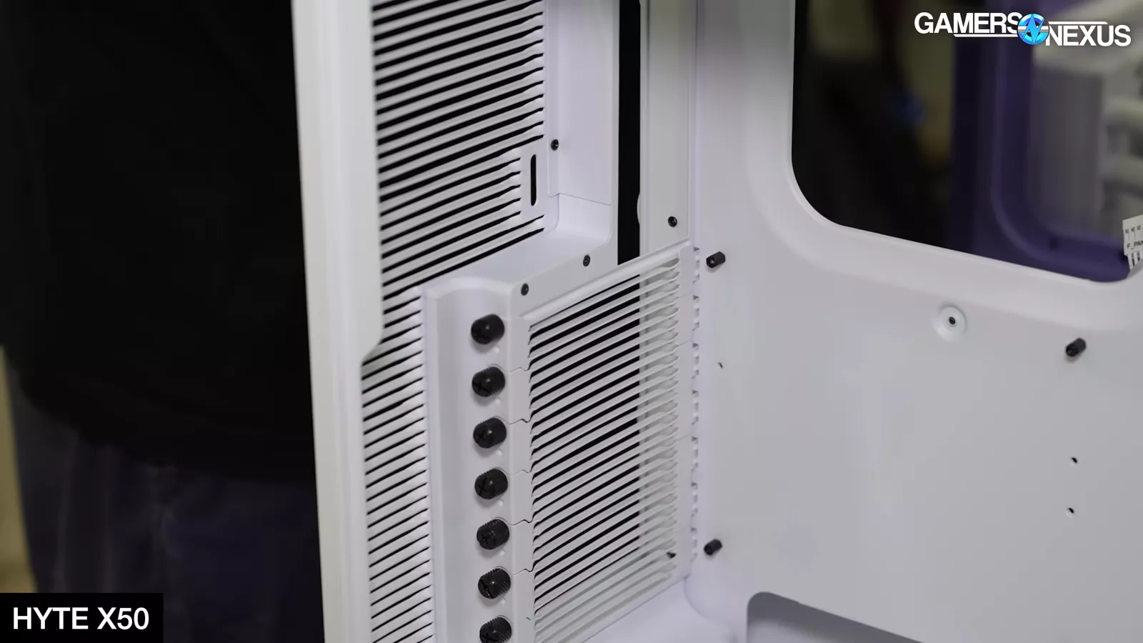 Hyte showcased its new X50 case, which is its most mechanically complicated product to manufacture to-date. The X50 uses a bubbly external look while attempting to be the highest-performing case on benchmark charts. Hyte uses a front panel that’s perforated all the way around the apex of the turn, leaving only a small strip at the mounting point for rigidity. The case also has louvered slats at the back, including for the PCIe slots, which add mechanical and manufacturing complexity but strengthen the chassis structure while improving airflow performance. Hyte noted that its intent, which we’ll test in our review, is to help project air away from the system, highlighting that there’s always focus on reducing intake impedance but noting that exhaust impedance is similarly important.
