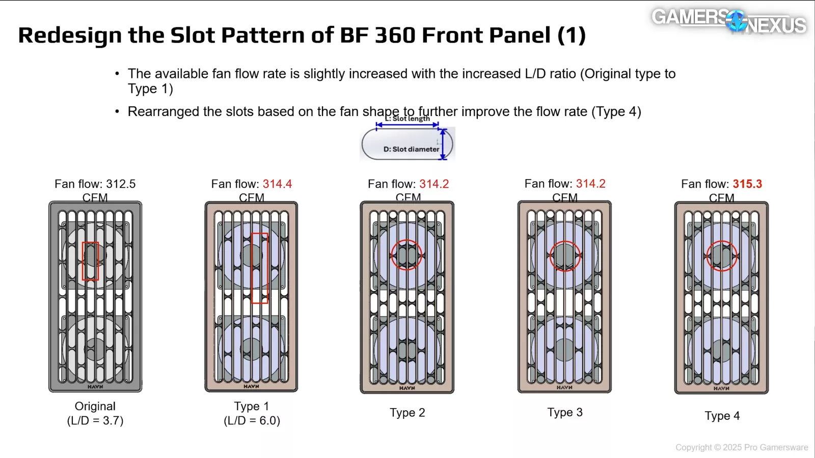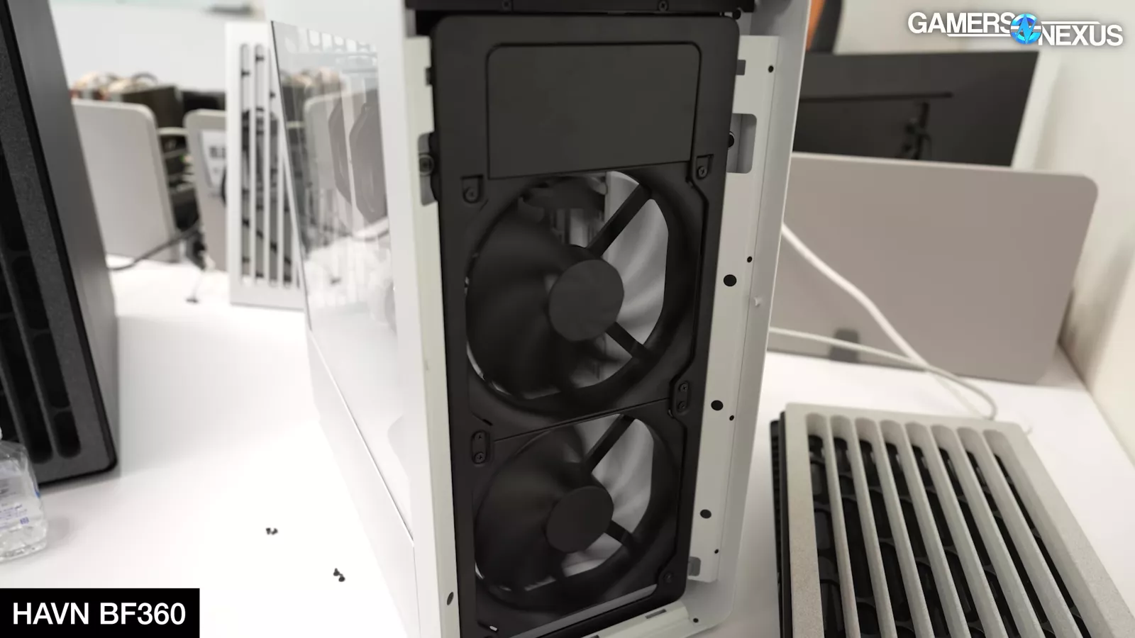 HAVN’s new BF360 aims to be highly competitive for case thermals and has dedicated a significant amount of that toward fine-tuning the fans. We’ll see how it does in testing later in the year, of course. The case will use 2x 180mm fans at 40mm thickness in the front, helping with higher static pressure performance. In testing, HAVN experimented with positioning these front fans higher versus lower on the front panel, settling to mostly bias them slightly up in the case. This should help push more air straight into the GPU, which gets further tuning from a “ramp” shaped at the front of the PSU shroud. HAVN tested numerous shroud ramp types and shapes, finding ultimately that a wide, relatively modestly angled ramp provided the best performance with the fewest acoustic trade-offs.