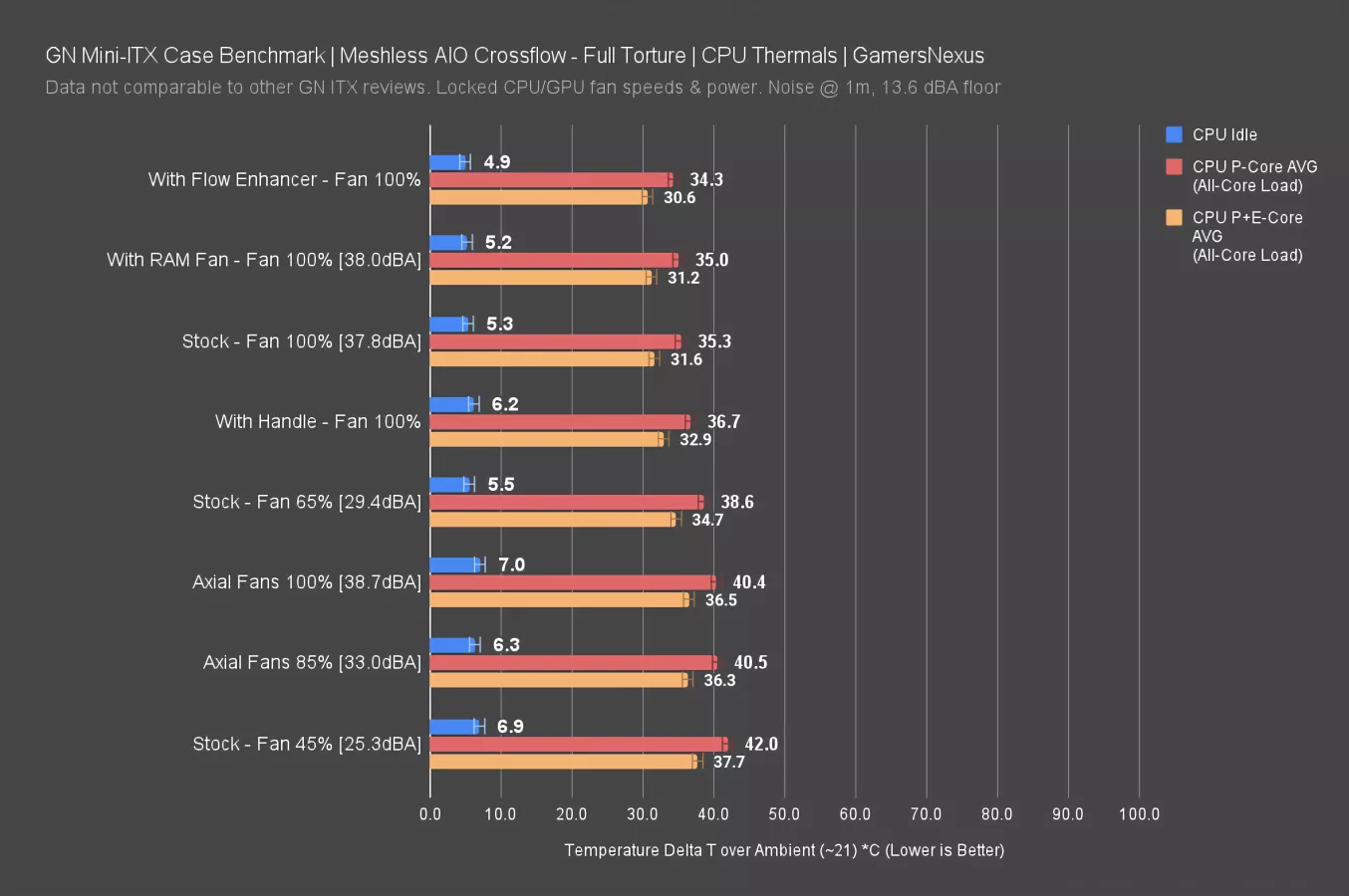 The axial fans otherwise did the best and were within error of each other. Using the cross-flow fan with the flow enhancer was 1 degree better than without the flow enhancer, but not as good as with the RAM fan.