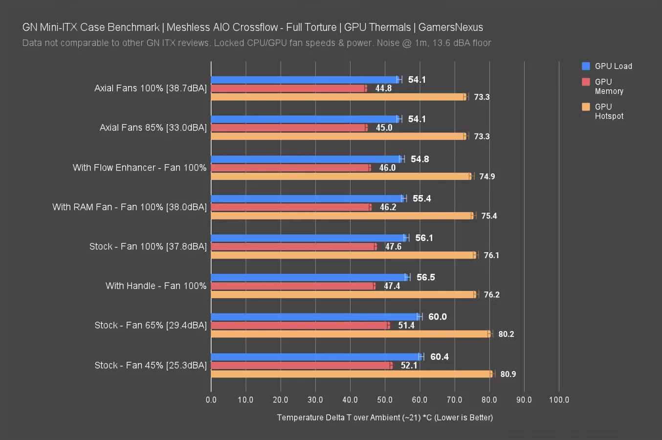 GPU thermals aren’t as good, so this is the weak spot, especially with a flow-through cooler. The axial fans were actually the best here, despite being mostly blocked. The GPU ended up at 54 degrees for average load temperature with both speed variations of the axial fans, although GPU memory temperature was slightly better on the 100% test but within variance. This isn’t abnormal to see: The GPU isn’t in the direct flow path of the fans, but it is far enough from the cross-flow fan path that it performs better axially. This mostly has to do with the pressure system that's forming within the case.