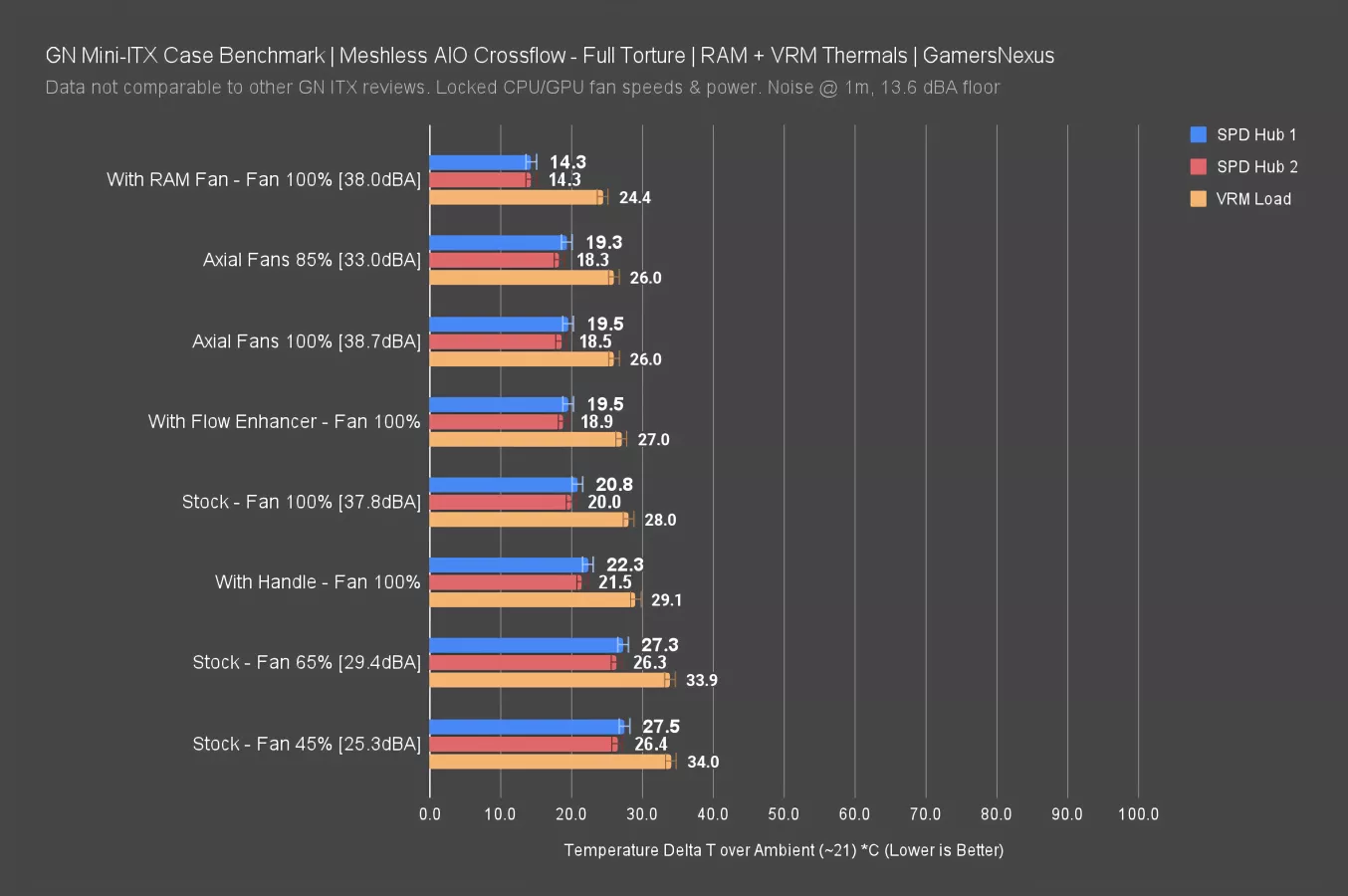 The tiny RAM fan definitely does something: SPD Hub temperatures on the memory dropped to 14 degrees over ambient when using it with the cross-flow fan with the memory fan, which is an impressive reduction of 5-6 degrees against the most relevant results. The RAM fan had a small benefit for VRM MOSFET thermals as well.