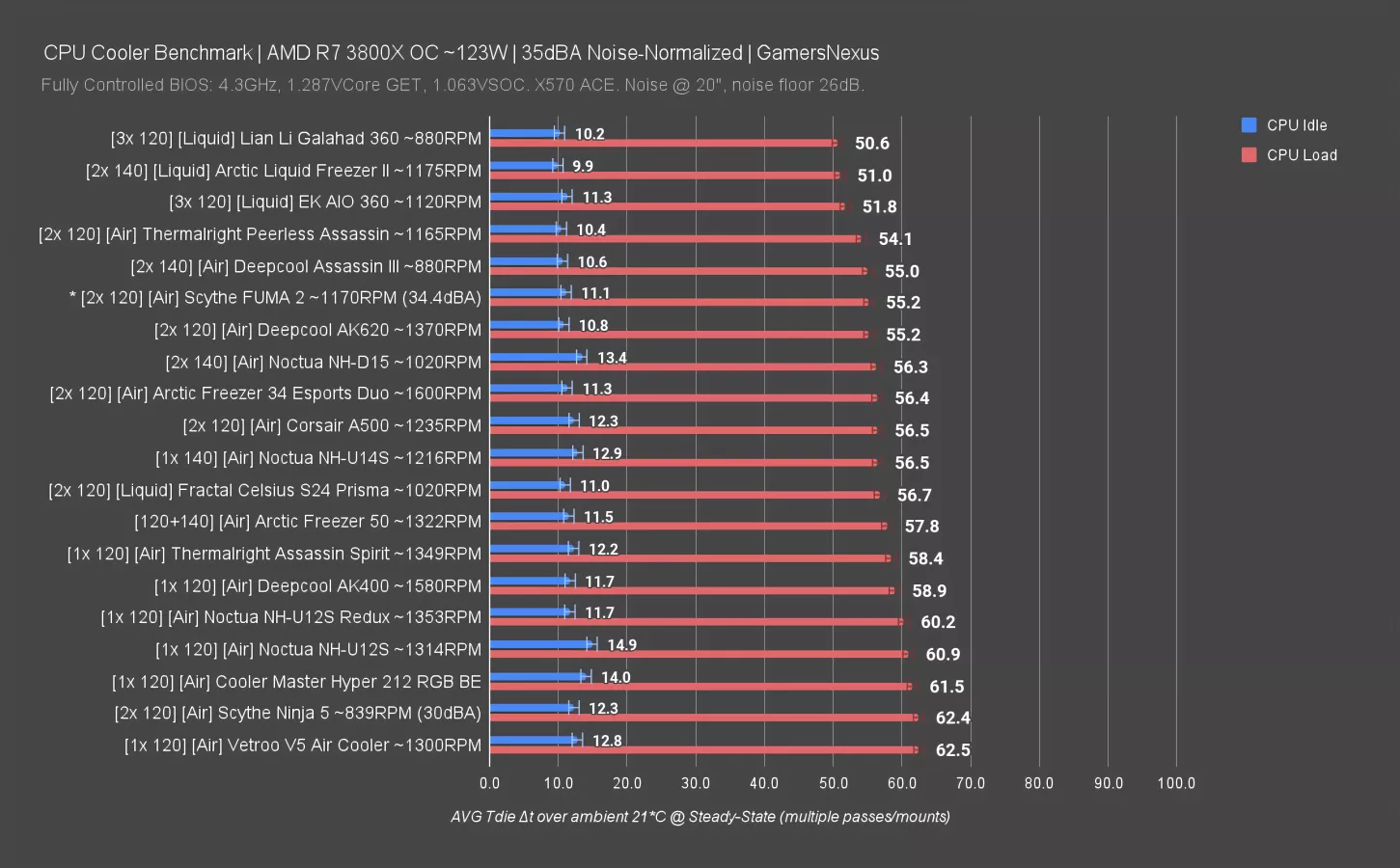 Here’s the chart for 35dBA noise-normalized thermals. The Peerless Assassin 120 charted at 54.1 degrees Celsius over ambient, placing it barely at the top of the list of air coolers we’ve tested.