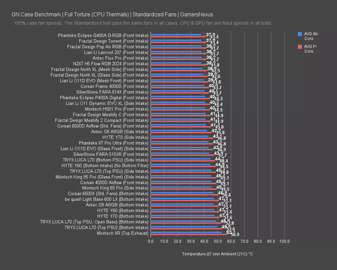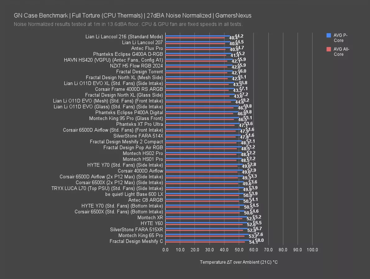 Relative to the rest of the chart, the Frame 4000D performed fairly well here. The Phanteks XT Pro Ultra is comparable in price and design, but it split the difference between the Corsair cases, with the Frame 4000D still a couple degrees cooler. The Lancool 207 (read our review) remains the budget case to beat with averages of 41 degrees across all cores and 45 on the P-Cores, while the NZXT H5 Flow 2024 (watch our review) and Phanteks G400A (watch our review) performed similarly well. The G400A remains difficult to find in the US.