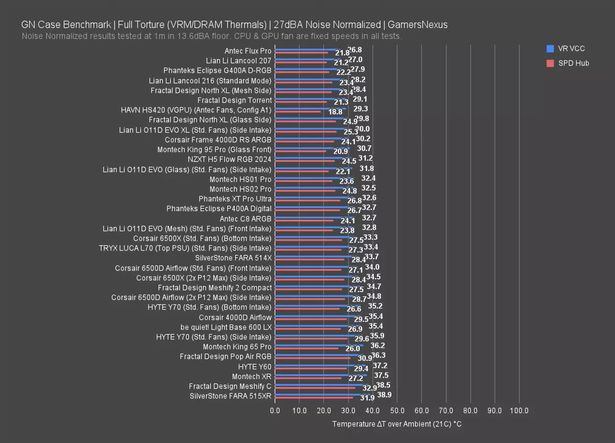 As a final note, the VR VCC sensor averaged 30 degrees above ambient in the noise-normalized test with the Frame 4000D. That puts it at the cooler end of what we typically see from cases, with only a couple of outliers like the Lancool 207 and Flux Pro dropping to the 27 degree mark.