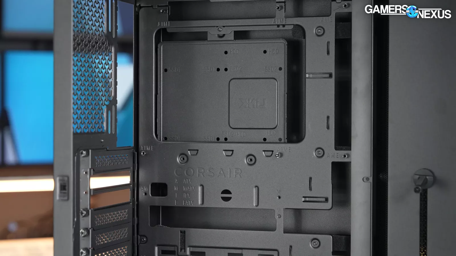 As for storage, drives can be mounted on two plates, one behind the motherboard tray and one under the PSU shroud. Each plate can mount either two 2.5" drives, one 3.5" drive, or one "iCUE LINK System Hub controller." We'll be interested to see whether Corsair comes up with a modular solution to fit more drives, but for now, that's it.