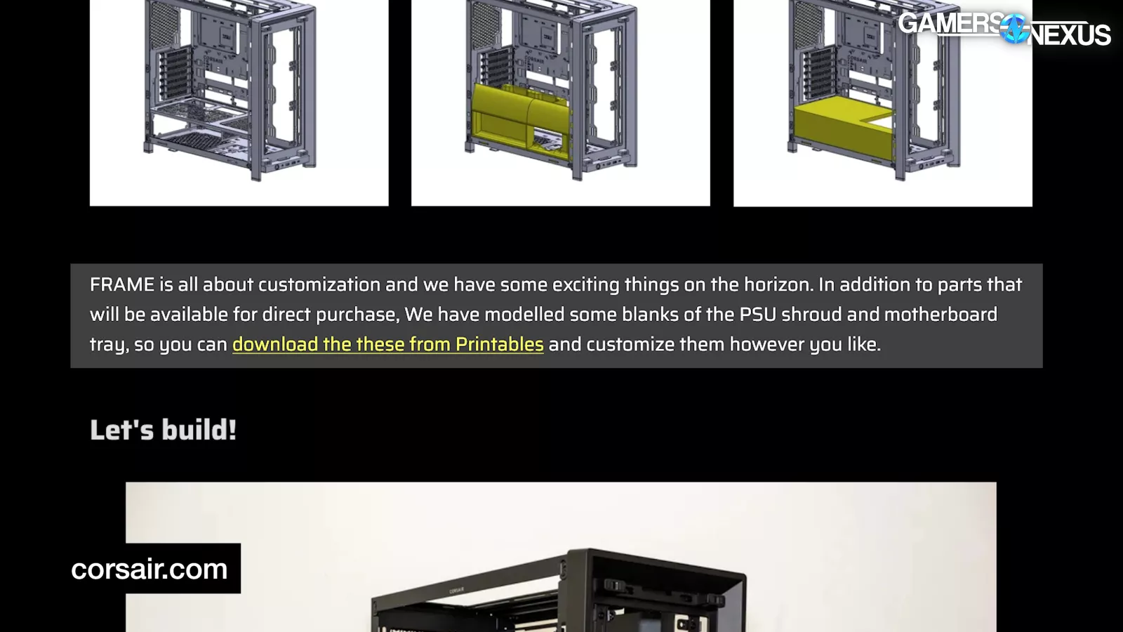 This is reiterated constantly in Corsair's marketing materials, including public blog posts: "FRAME is all about customization and we have some exciting things on the horizon. In addition to parts that will be available for direct purchase, We have modelled some blanks of the PSU shroud and motherboard tray, so you can download [...] these from Printables and customize them however you like."