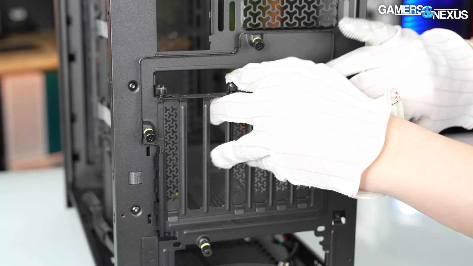 The vertical GPU mount is surprisingly quick to set up: by loosening two thumbscrews around the expansion slot covers, the entire set of seven slots can be removed and rotated 90 degrees. A riser cable can then be installed and supported by two standoffs installed on the surface of the PSU shroud. Using the built-in mounting holes, a maximum of three vertical slots are usable. Obviously Corsair intends for you to purchase a Corsair riser cable, but if you want to use your own, the holes are spaced 122mm apart.