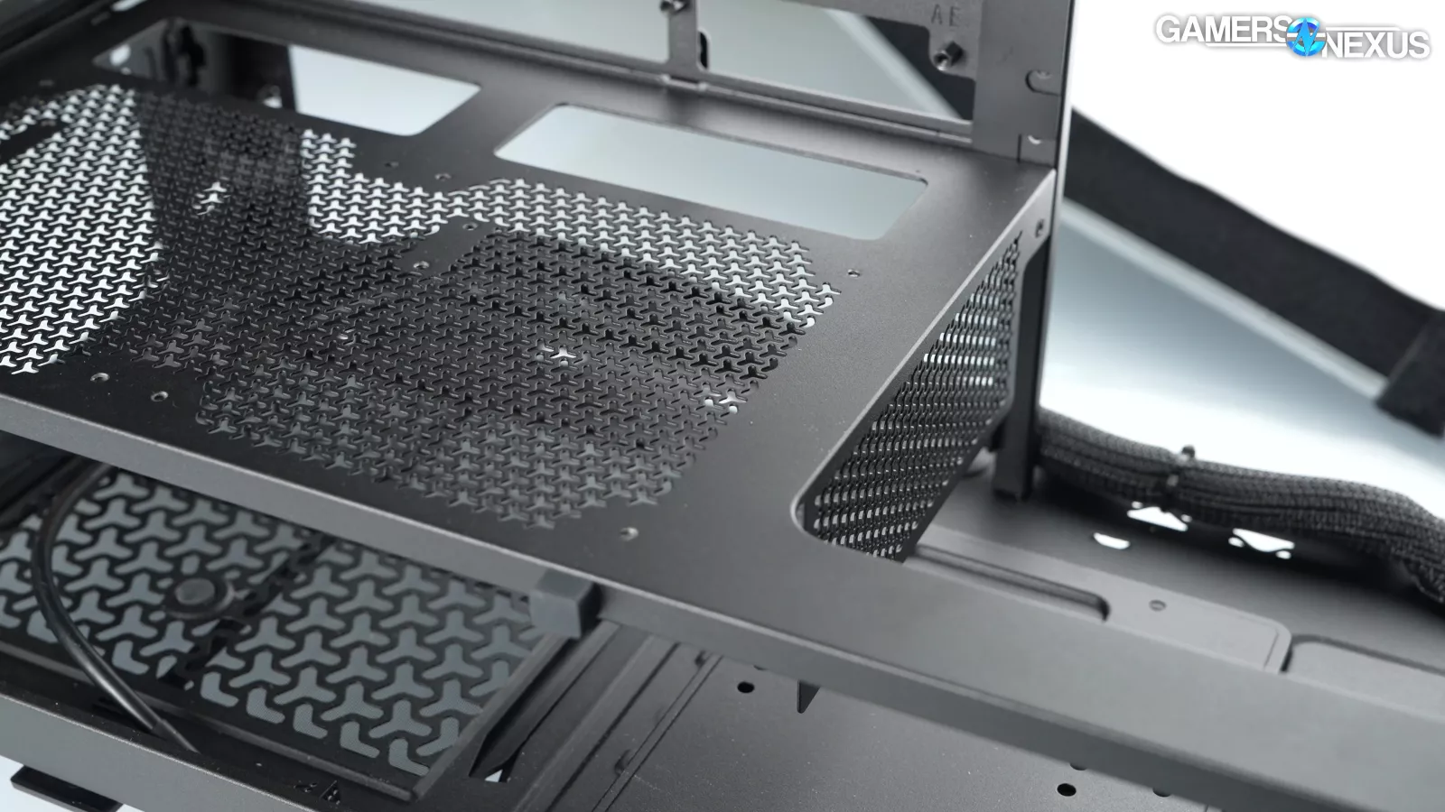 The case also has a Lian Li-ish strip of mesh ventilation below the glass side panel and it ships with the translucent insert. If you install fans in the two 120mm slots on top of the PSU shroud, we'd recommend getting rid of the inserts entirely.