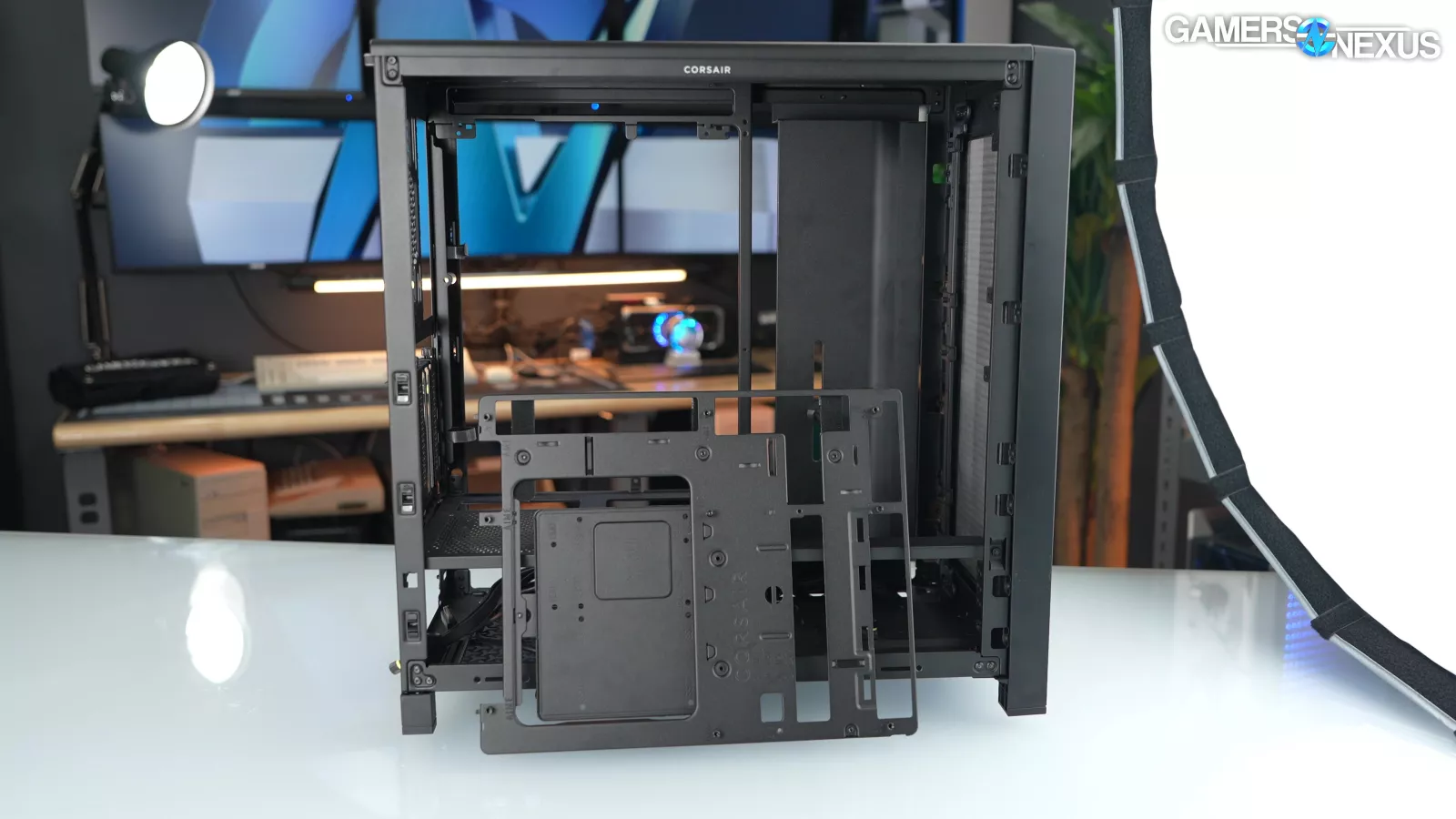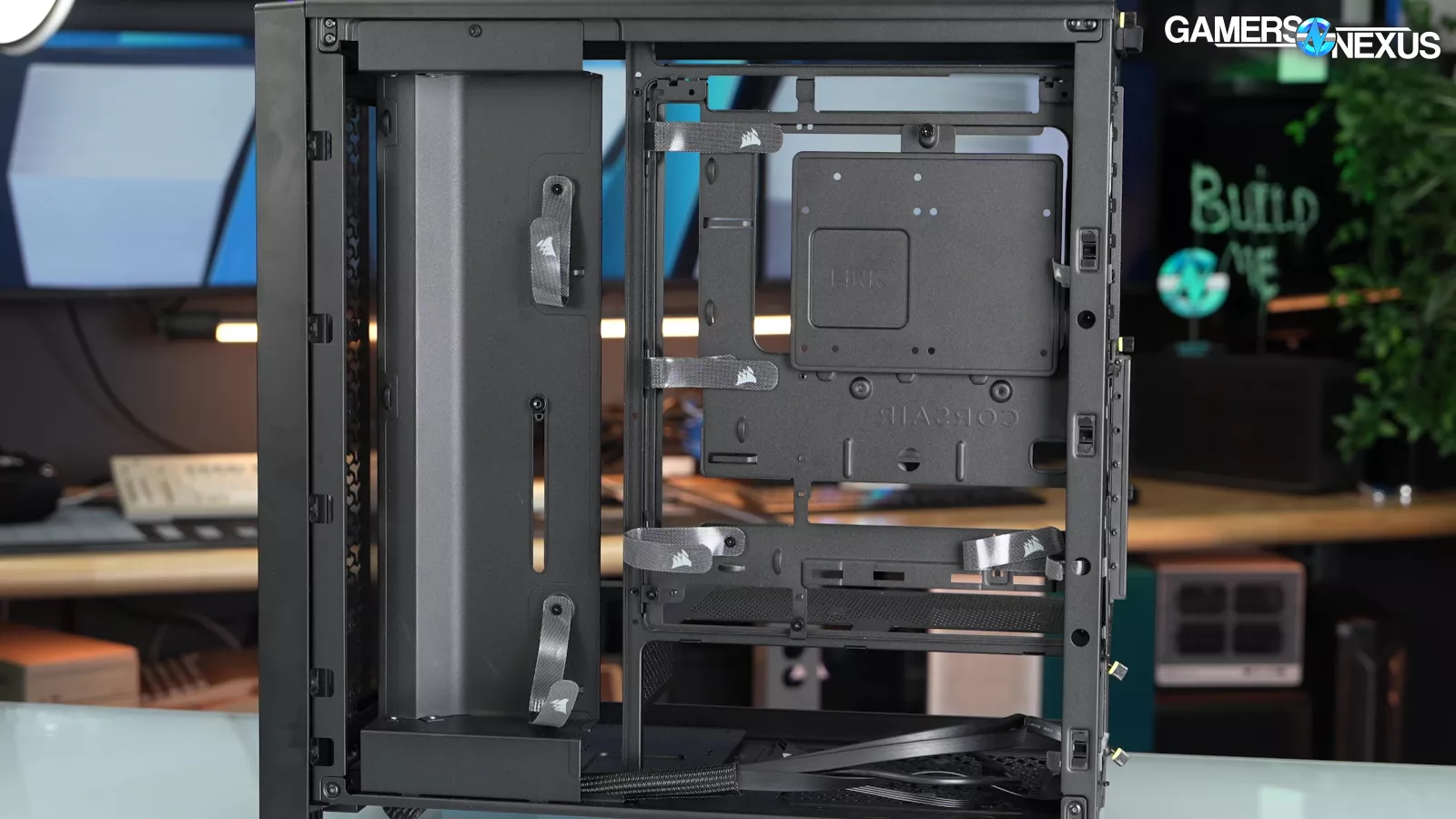Today we’re reviewing the Corsair Frame 4000D and the case is modular in some interesting ways. For instance, the motherboard tray and power supply shroud/tray can come out. And that’s what gets us to the name “frame.” It’s a frame of a case and it can be reconfigured.