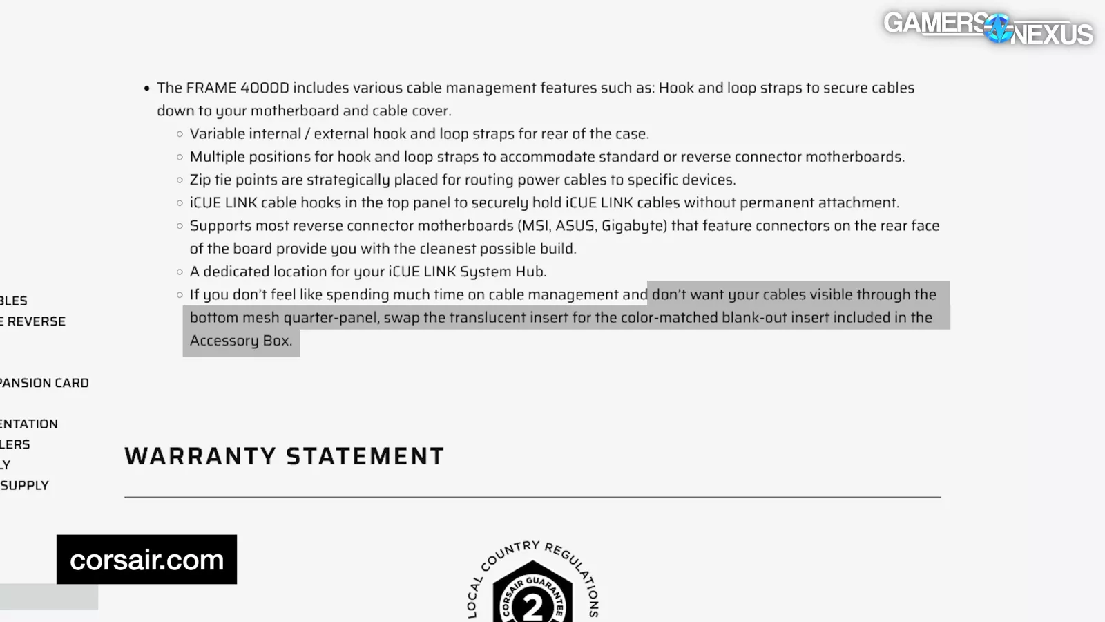 We'd like to see a paper manual included with the case in addition to the version on Corsair's blog. The benefit of the online guide is that it can be updated; for example, the online manual now explains what the point of the strip of mylar in the accessory kit is, whereas we had to email Corsair (it covers the reverse-connector holes in the motherboard tray when they're unused). A paper manual can’t be updated, which is a downside as much as it is an upside: The upside is that a company can’t gaslight a customer if something proves incompatible and is retconned. It’s also just more convenient to build a computer with a physical manual.