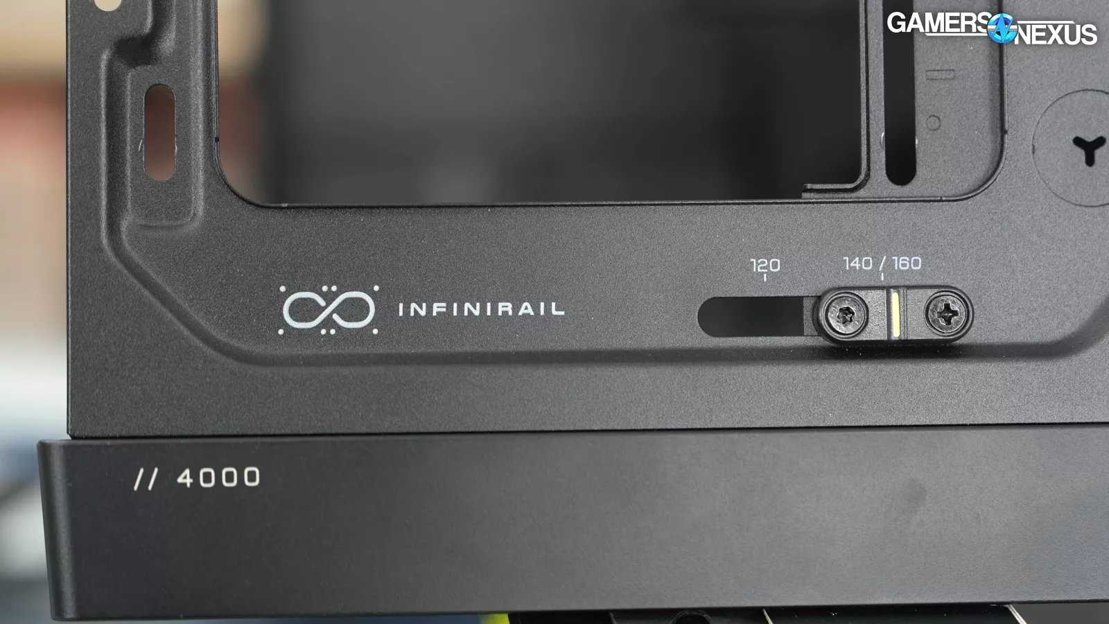 The Frame 4000D uses the so-called "InfiniRail" system. At the front of the case, there are two metal rails that hold up to 12 plastic clips. The rails slide in and out for 120mm or 140mm mounting, and the clips slide up and down the whole length of the rails. Technically, the rails can fit 200mm fans at their maximum width, but only by forgoing the clips and mounting directly to the rails.