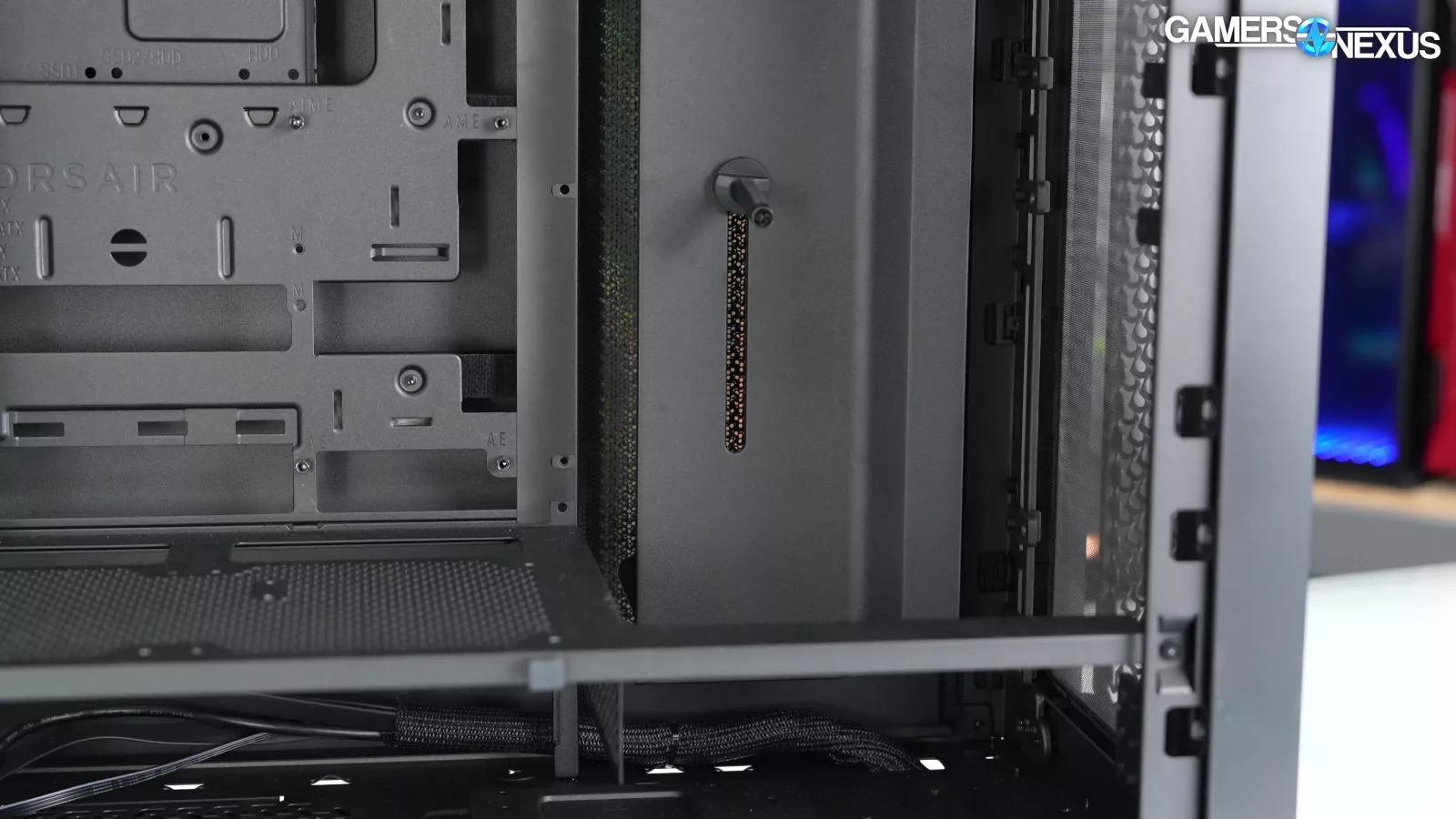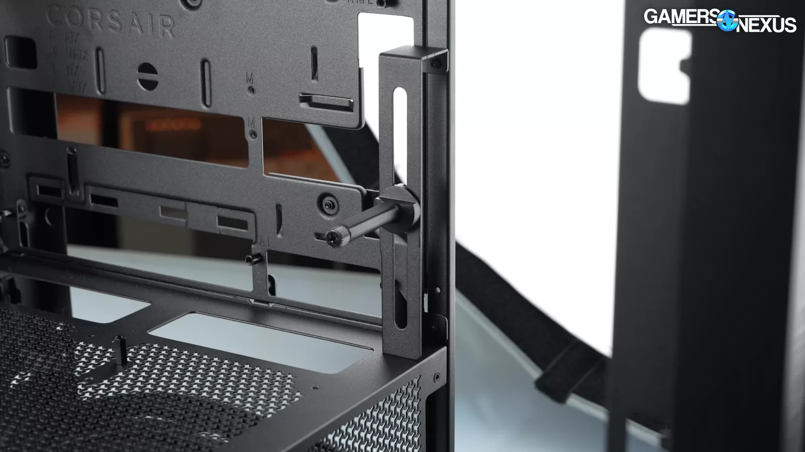 There's a cable cover at the front of the case that can be installed in one of two positions, but as is frequently the case, we were only able to use it in the forward position because of the ATX power cable. The other position is better suited to back connect motherboards, of which ASUS BTF, MSI Project Zero, and Gigabyte Project Stealth have been validated by Corsair to work. The cable cover is extremely easy to remove, requiring only a single screw, and it's equally easy to slot the side fan mount from the accessory kit in its place. The side fan mount is another feature that will become more interesting if Corsair introduces a Frame 4000X or other variant with a sealed front panel.