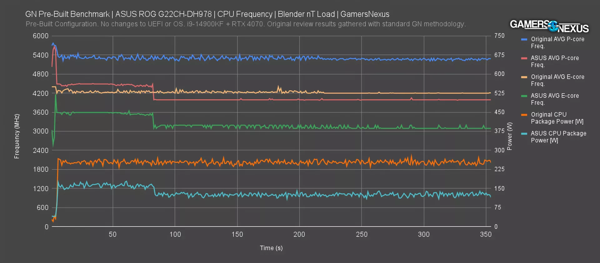 Here’s a frequency chart comparing the 14900KF in the ASUS computer to frequency data for the 14900K gathered in our original review.