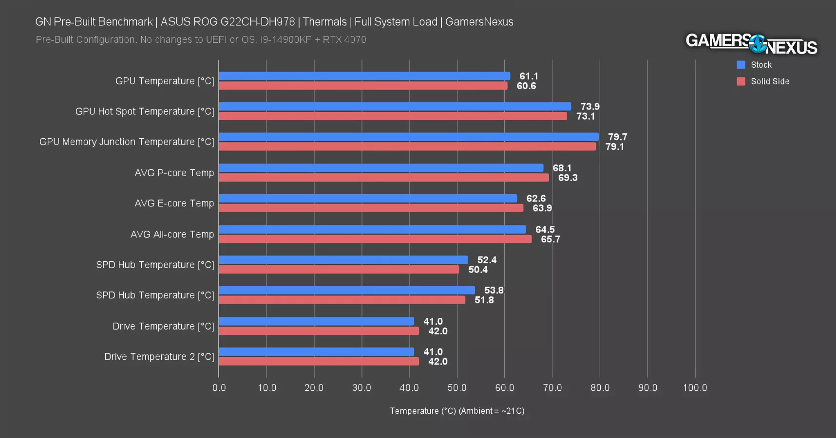 Given that restriction, CPU P-core average temperature peaked at 68-69 degrees Celsius with the solid side panel installed. Sticking with the stock mesh panel gave roughly 1 degree lower temps across both the CPU and SSD. ASUS could have safely allowed a moderately higher power limit given the 20 or so degrees of headroom. It’s possible that the motherboard VRM is also a limiting factor.
