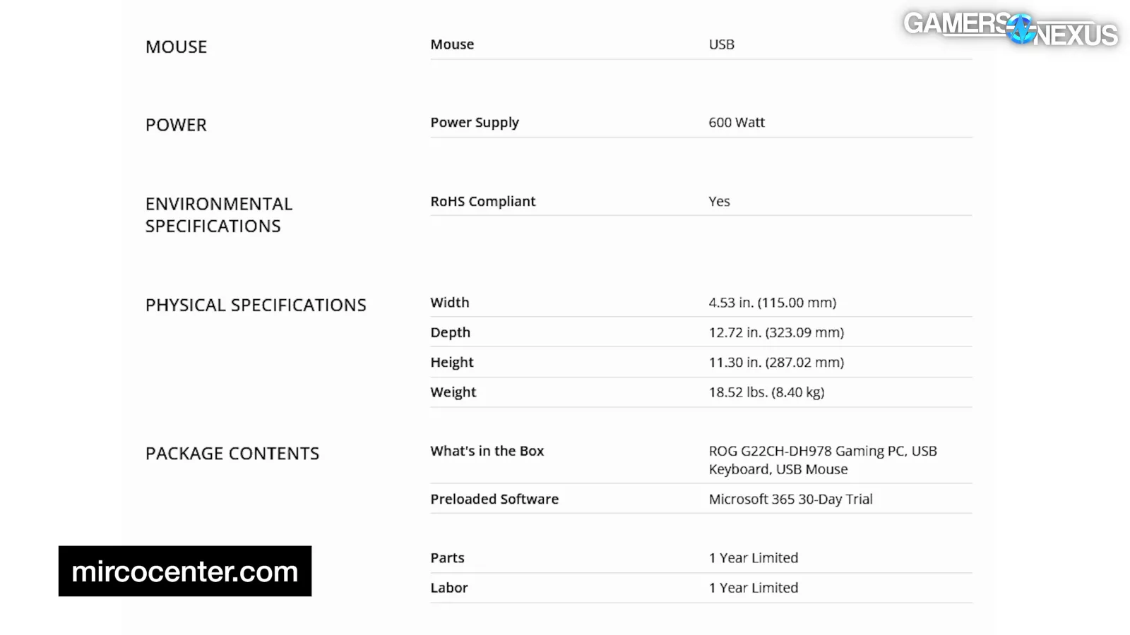 This is the part and price breakdown of the G22CH-DH978 variant we bought. We used identical parts where possible when building a DIY list, but the ASUS system has a lot of proprietary bulls****, so we picked the closest stuff that made sense for price and kept the general spirit of the build.