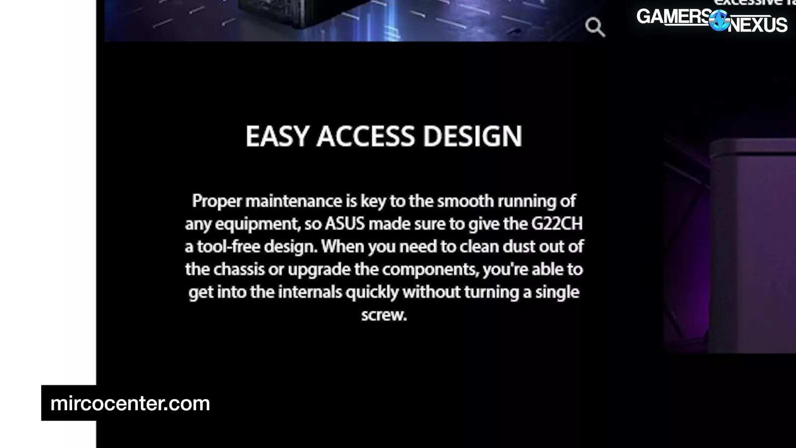 ASUS gets its own computer’s dimensions wrong, the retail page calls the side panel “tempered glass” despite it being plastic, and it says the design doesn’t use screws, but it does, and the system is a clown car of component choices with its DDR5-4800 RAM, and it’’s limited power budget for Intel.
