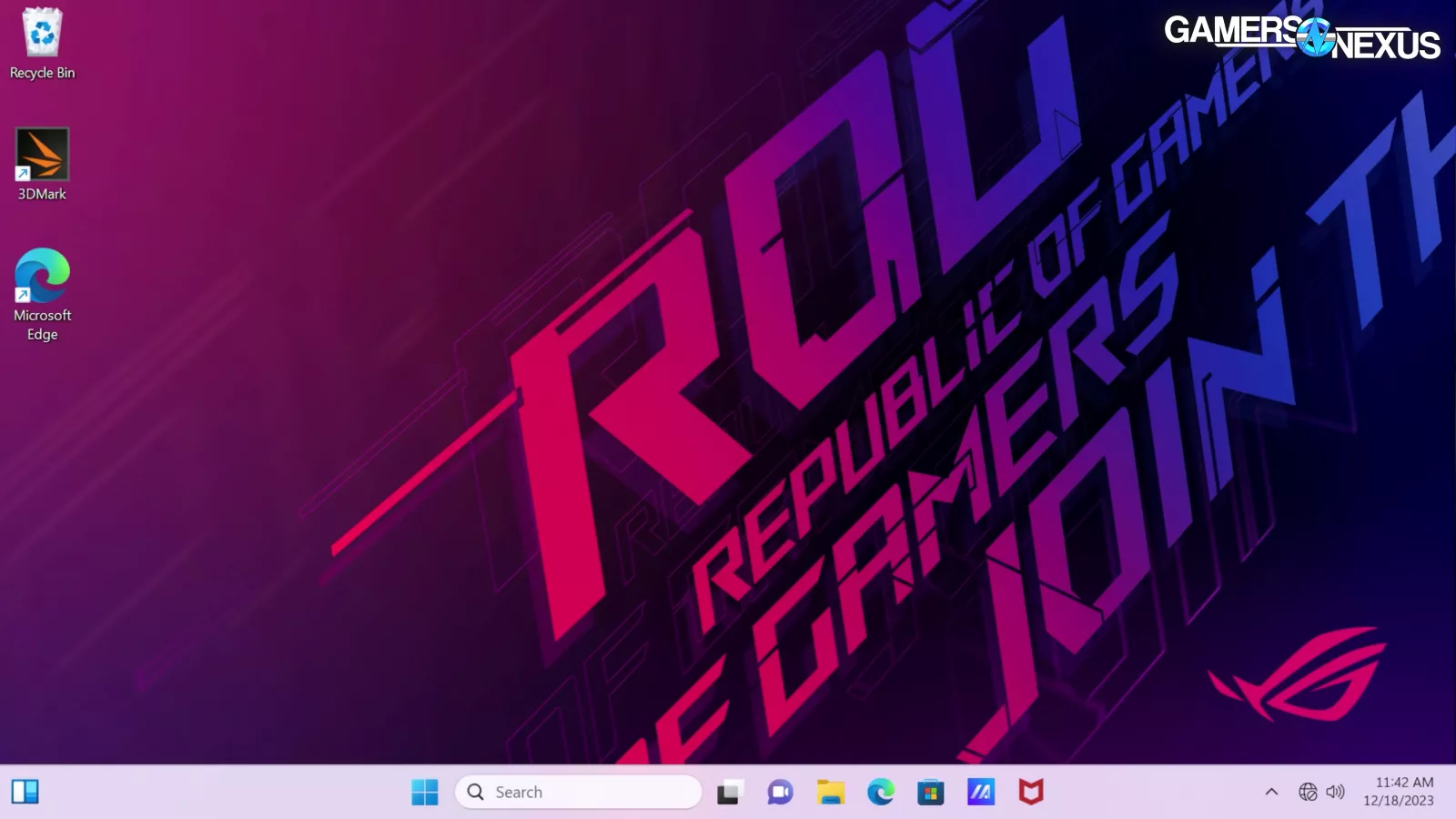 Upon finally hitting the desktop, we were greeted with a suitably cool/edgy neon R-REPUBLIC O-OF G-GAMERS wallpaper. There weren’t any popups, but the start menu had the full complement of ASUS bloat: MyASUS, Armoury Crate, Aura Creator, and McAfee, which was the only one actively running in the tray and also the worst of these.