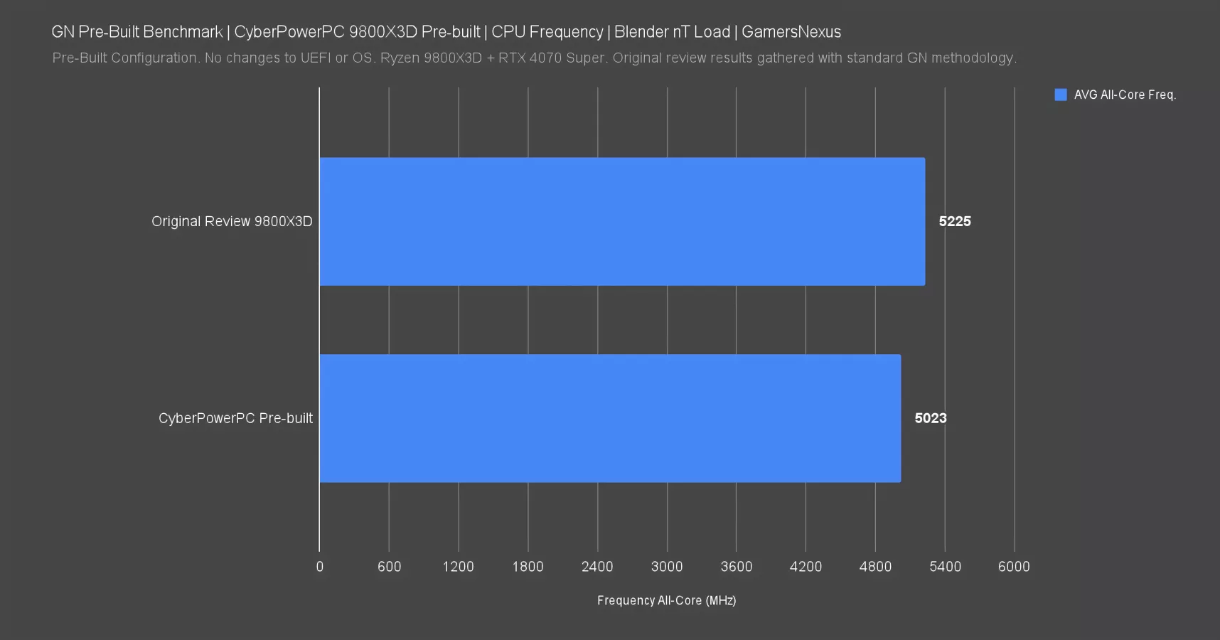 The Cyberpower system’s CPU cores averaged out to 5,023MHz during the CPU-only portion of our test – that’s 200MHz lower than in our original review of the 9800X3D. This is a gigantic drop when considering it’s applied across all cores. This indicates that the CPU’s not able to consume enough power to keep clocks high due to the thermal constraints. It’s throttling. This is a huge disappointment for an otherwise promising system. A drop of 200MHz is massive when looking at an all-core load.