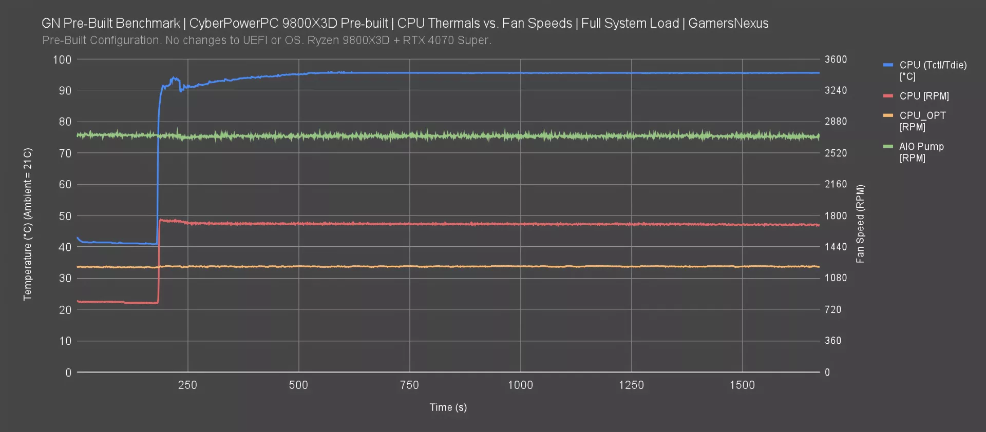 Tdie jumps over 90C as soon as the test starts, then dips as the CPU fans ramp to try to keep it under control and as the GPU load prepares to run. The fan ramp comes with an acoustic cost. We can see that the AIO pump and front panel fan speeds don’t change at all, even as the CPU hits 95 degrees Celsius. The pump is fine since it’s maxed out, but the relatively low 1,200RPM on CPU_OPT isn’t ideal. It may be due to the specific fan choice topping out at that RPM, or due to some inherent behavior of the CPU_OPT header which isn’t directly controllable in BIOS. Either way, what’s clear is that this temperature is totally unacceptable. It’s unfortunate, as a lot of other aspects of the machine were good. This has been our historic experience with Cyberpower, though: The company just really seems to struggle with thermals.
