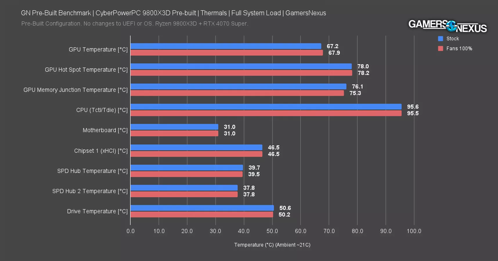 The rest of the system’s thermals also remained within variance between the two configurations. GPU, chipset, SPD hub (which is RAM), and drive temperatures were within expected ranges. The 67 degree GPU temperature is good.