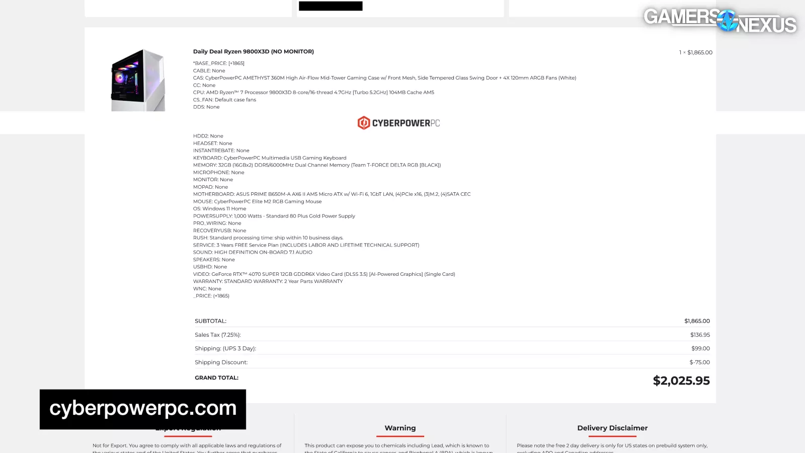 We jumped on this system from CyberpowerPC as a “Daily Deal” because it had a Ryzen 9800X3D with a good configuration on paper at what looked like a reasonable price at $1,865. Again, that’s before the 50-series was announced. It was also a rotating daily deal, which phased in and out.