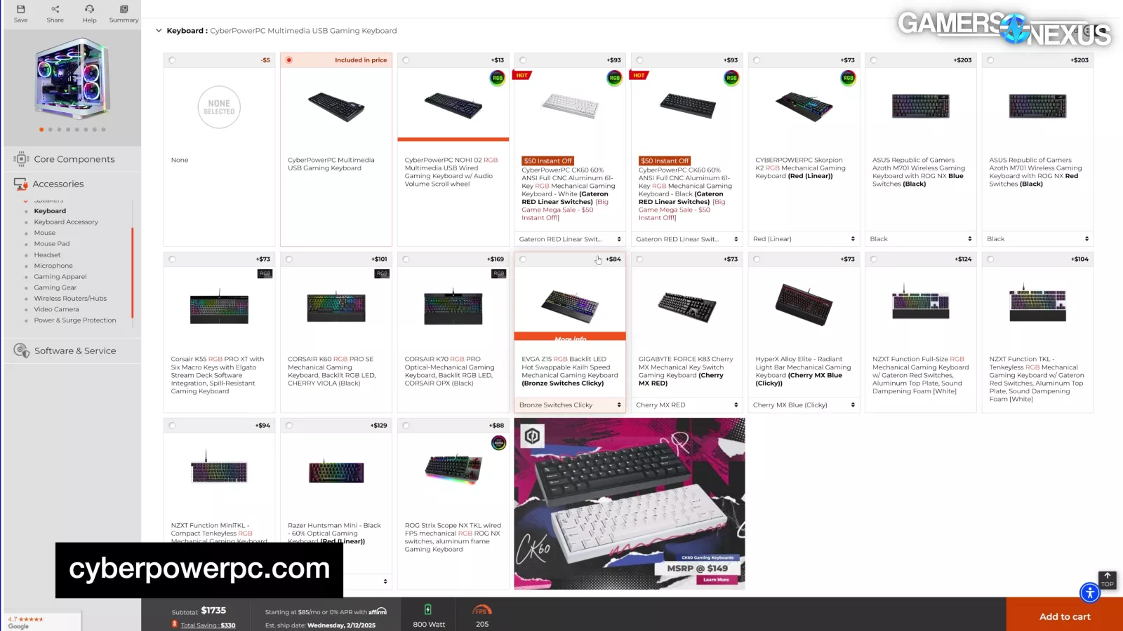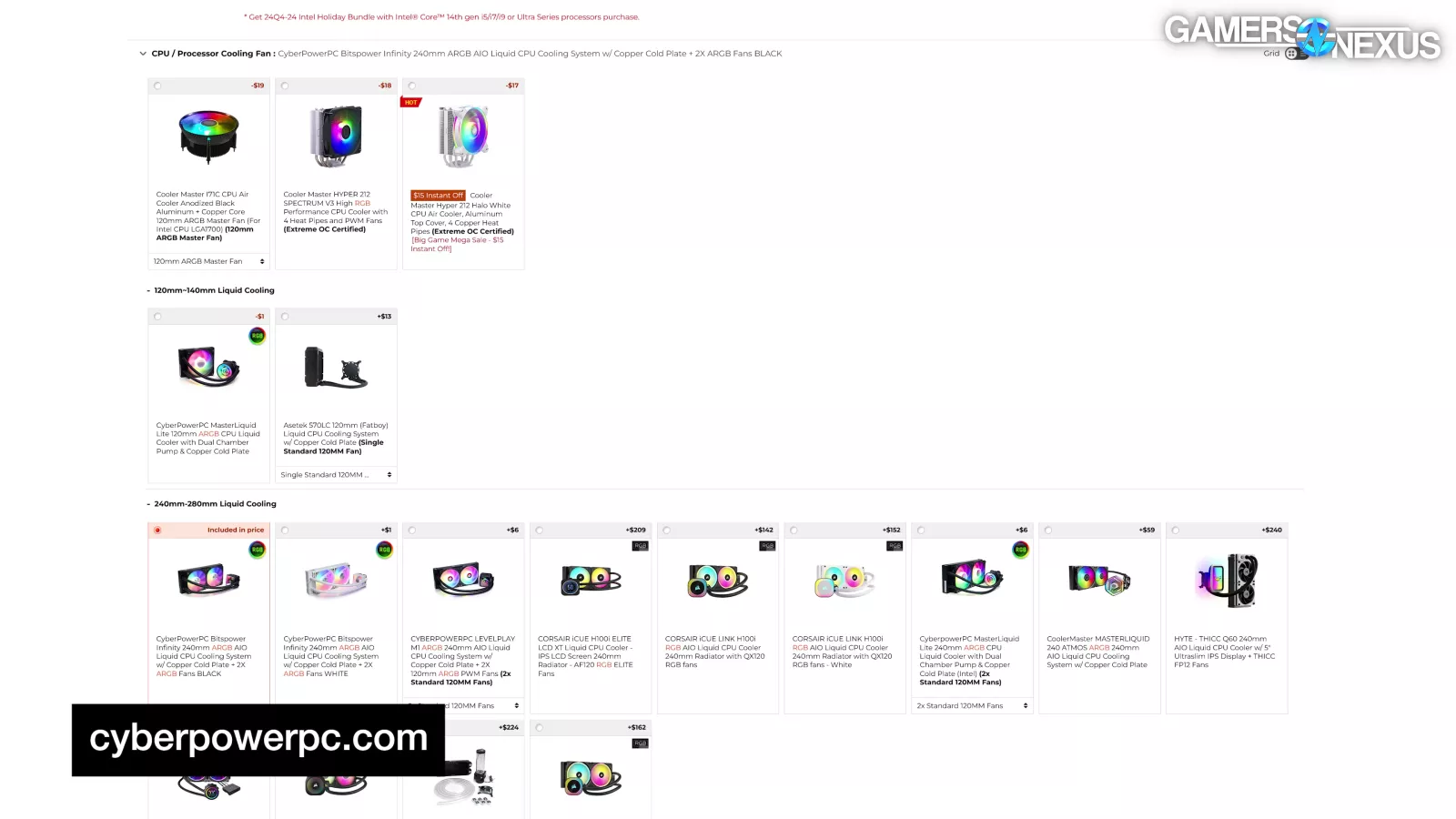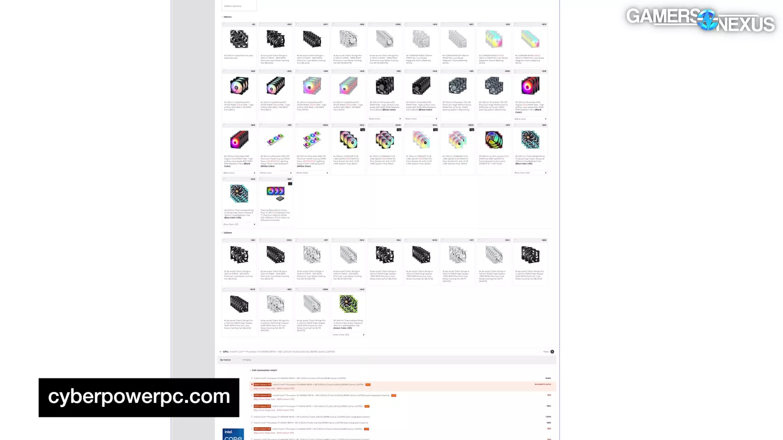 The Bitspower 240mm cooler and white-labeled Cyberpower case can’t be purchased retail from anywhere we saw, so we subbed those out with reasonable alternatives for DIY comparison.