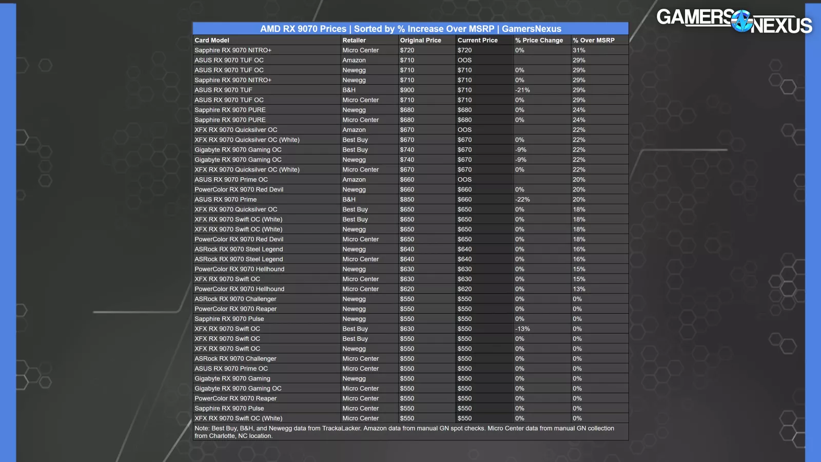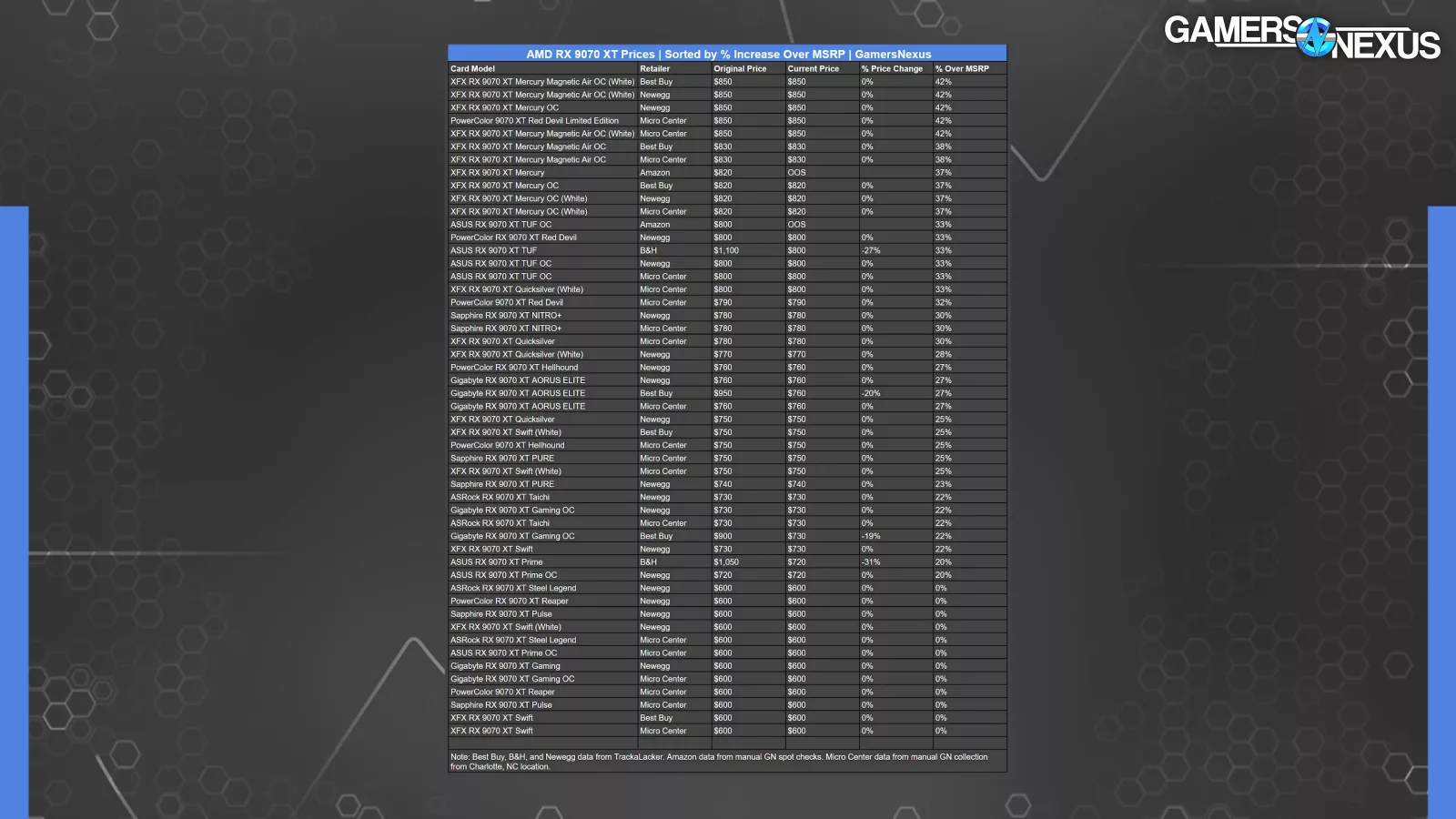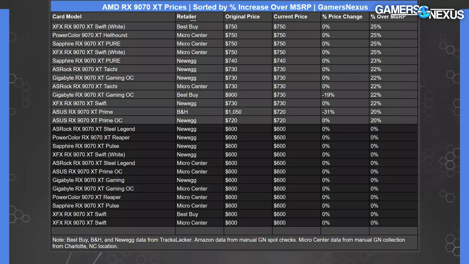 We prepared this table of RX 9070 XT (read our review) prices through a combination of data from TrackaLacker and some manual data collection. It shows the card model, retailer, original and updated price (if applicable), how much the price changed, and how much the price is elevated over the base MSRP of $600. Because of the way Amazon aggressively de-lists and removes prices, anything from Amazon is just what we came across in a spot check on the morning of launch. Pricing data may change by the time we publish due to a fluid market.