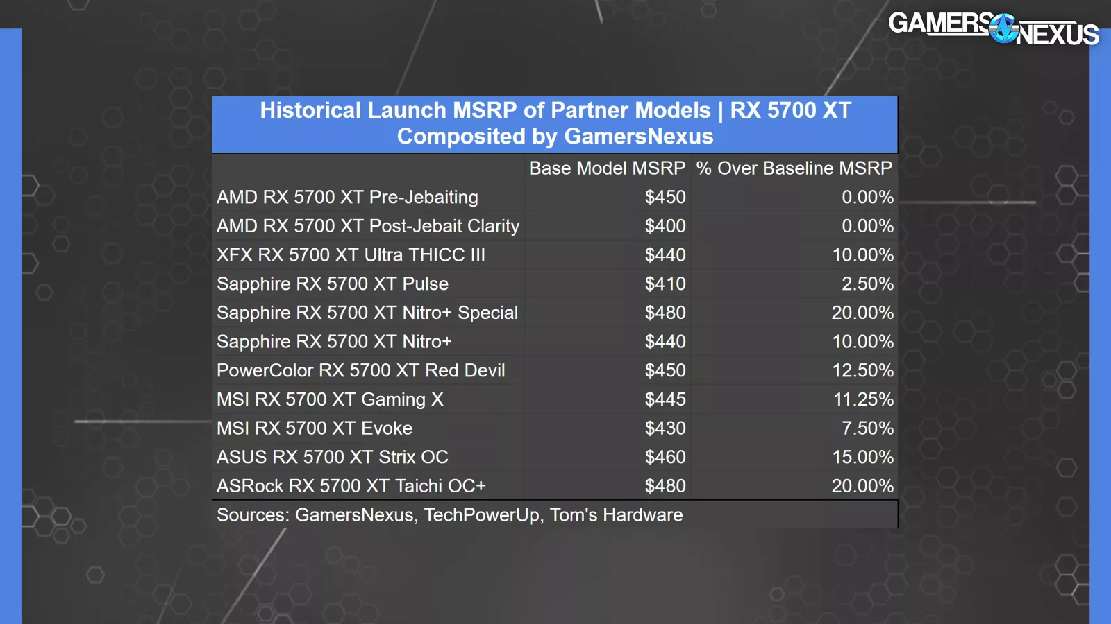 Here’s the 5700 XT. The 5700 XT had two prices. The first was $450, but after it jebaited itself, it came down to $400 pre-launch. Using the $400 price as the reference since that was launch pricing, the uplift for the cards we found via TechPowerUp and our own prior GN reviews ranged from 3% to 20% increased over MSRP. The $480 Taichi OC+ was among the highest.