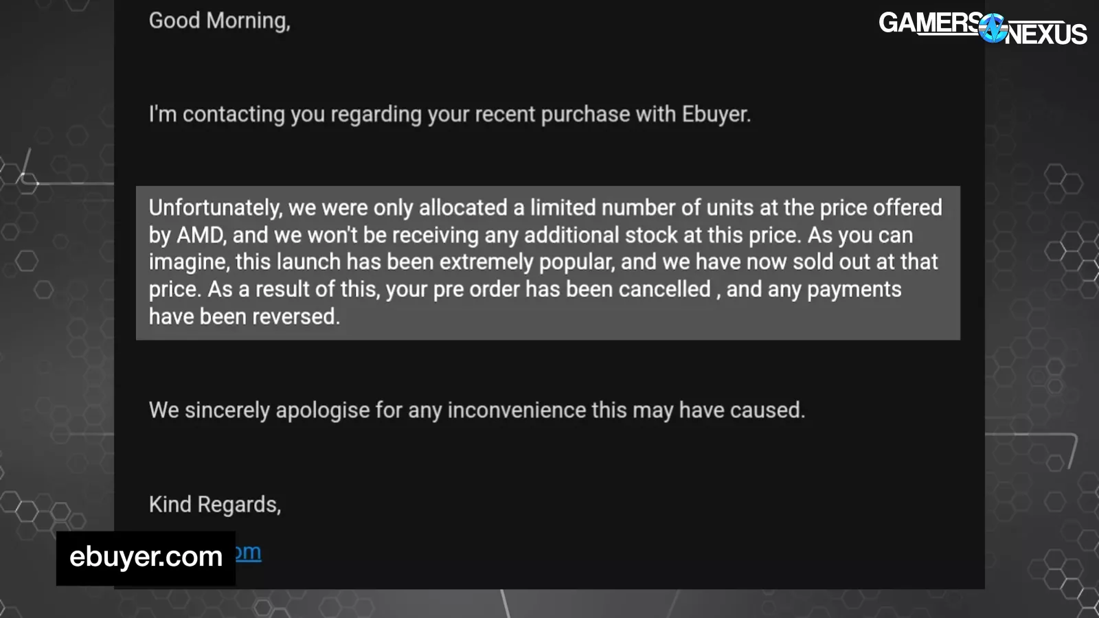 “Unfortunately, we were only allocated a limited number of units at the price offered by AMD, and we won't be receiving any additional stock at this price. As you can imagine, this launch has been extremely popular, and we have now sold out at that price. As a result of this, your pre order has been cancelled, and any payments have been reversed.”