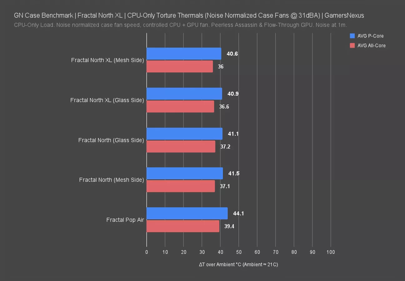 In this one, the North XL remains the chart leader, followed by the North XL with a glass panel -- these are the same result. The original North is next, then the Pop Air. The total range here is about 4 degrees which, considering it’s a CPU-only workload and these cases are all relatively good airflow, is a good start for range.