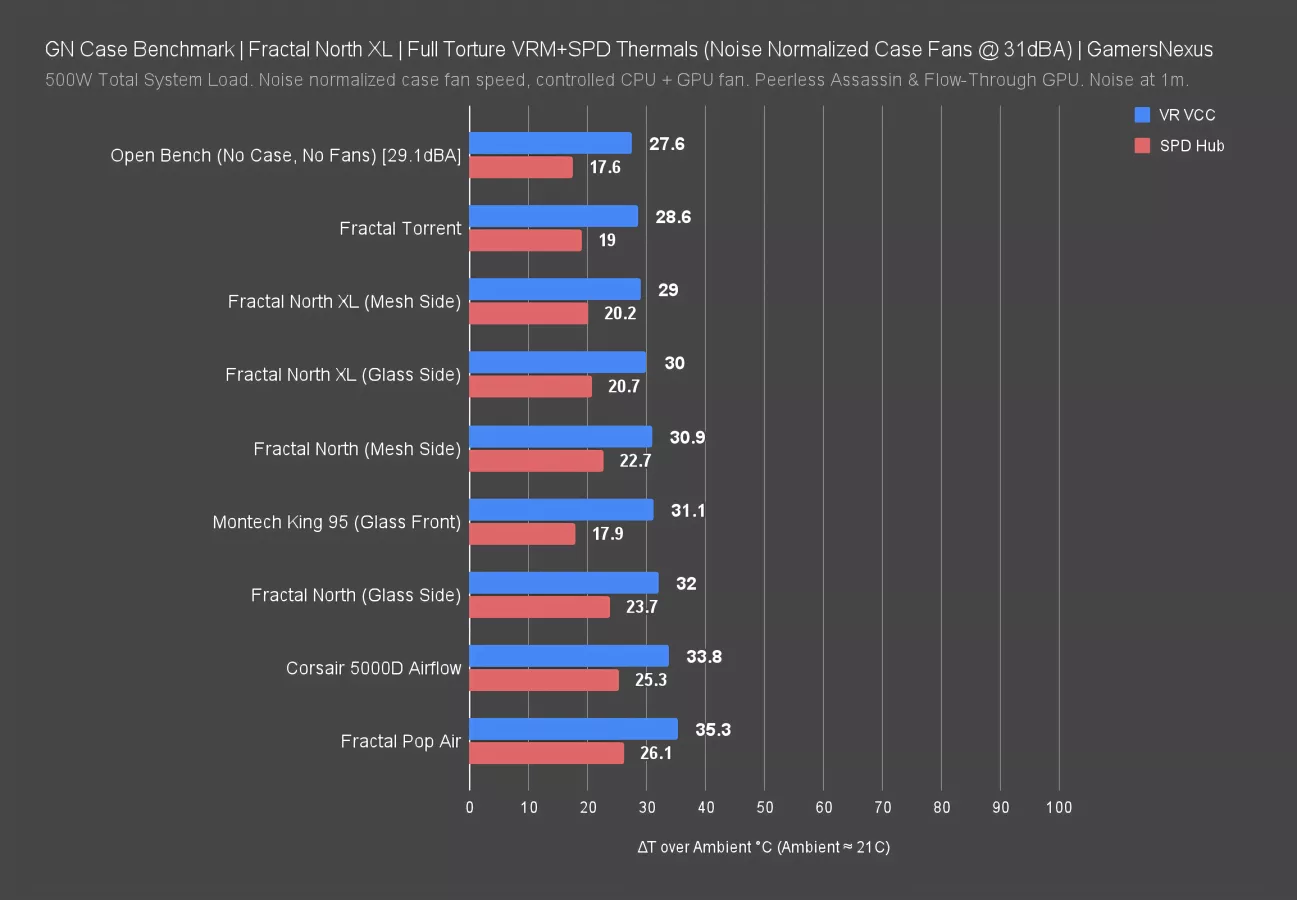 The first set of thermal data is for noise-normalized testing at a chosen 31dBA threshold in our hemi-anechoic chamber, tested at 1-meter distance and with a noise floor of about 13.6dBA. Noise normalizing in the chamber means that all cases are set to the same noise level, so they are unable to leverage extremely loud, super high RPM solutions to beat their way to the top of the chart. This makes the playing field level and fair, so they must compete on merits of the total case and cooling design, not just brute force.