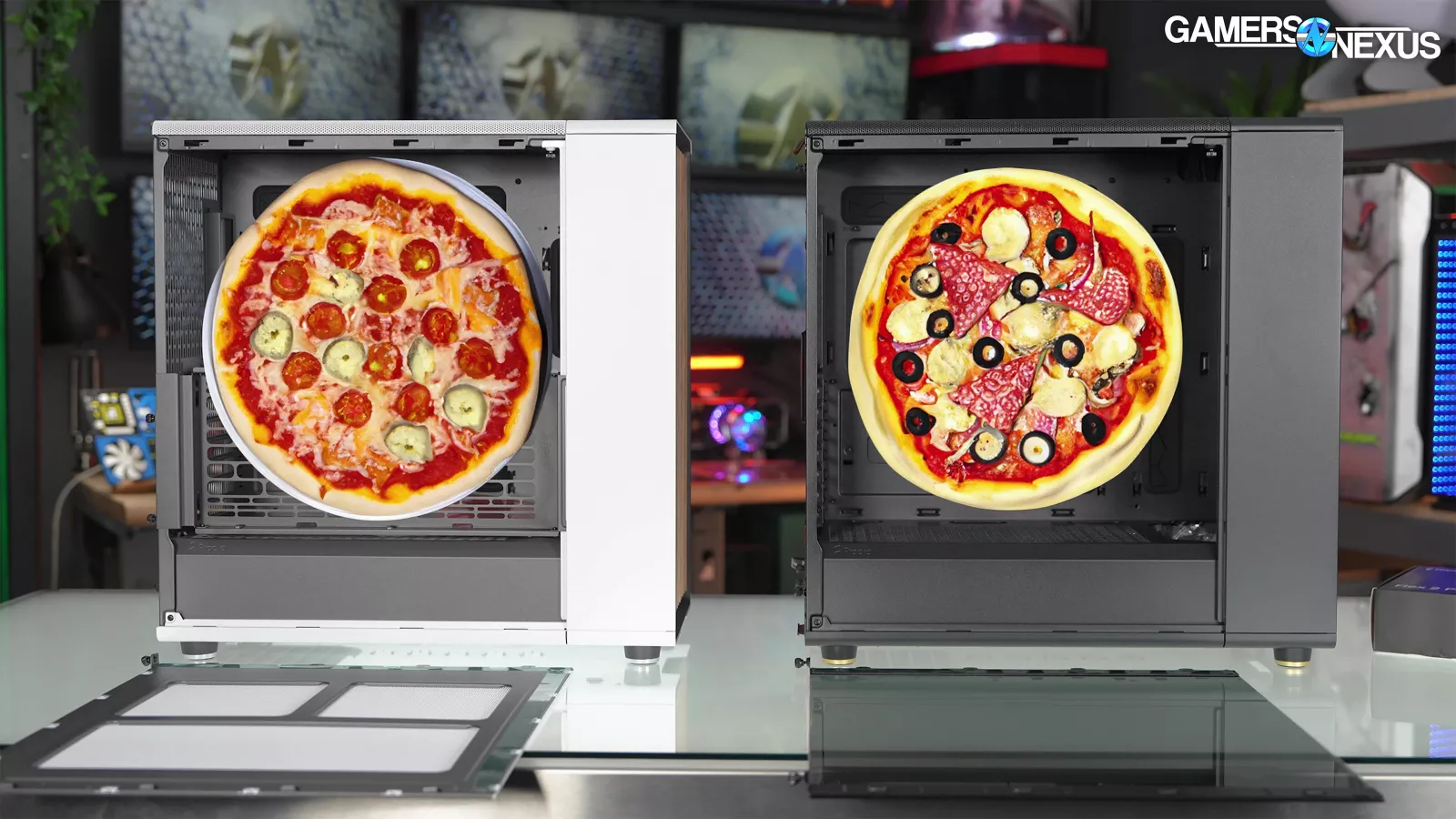 Regarding components, the major change is that the XL can fit GPUs up to 413mm without removing any fans, which is enough to fill a 16-inch pizza. This is up from 355mm in the original. The 4070 Ti we use for case testing fits in the original North, but there's not enough space for Gigabyte's GPU support bracket; the XL, however, has enough space for both the support bracket and the GPU.