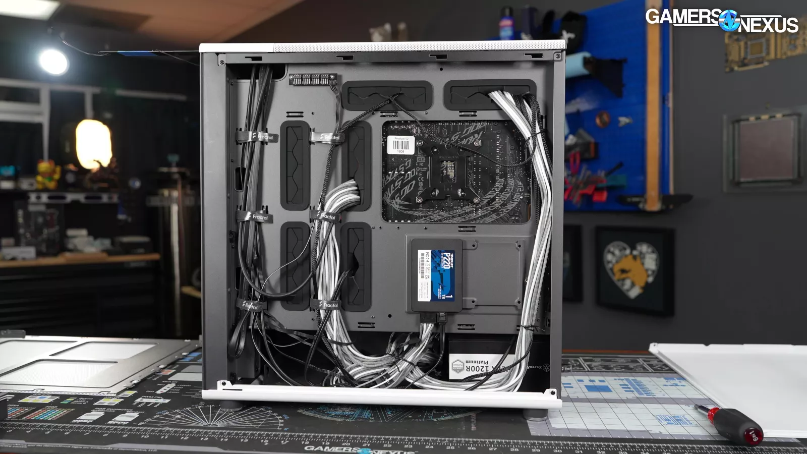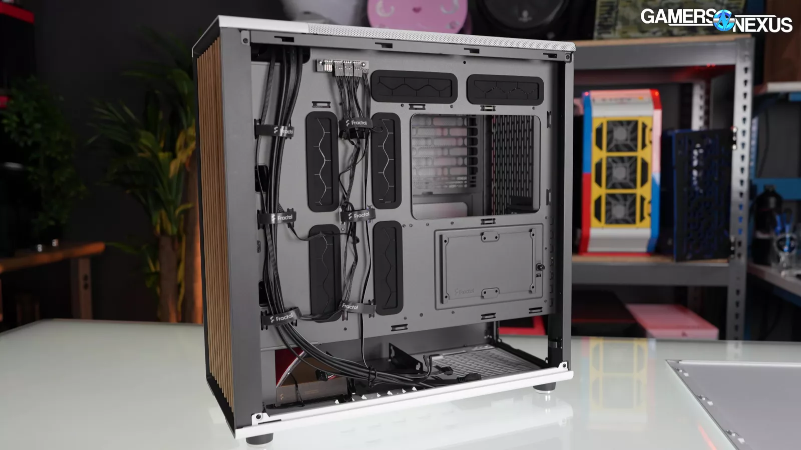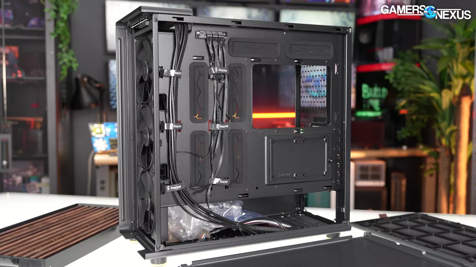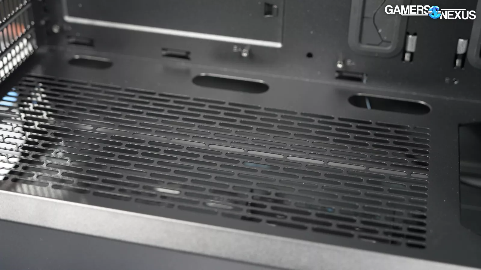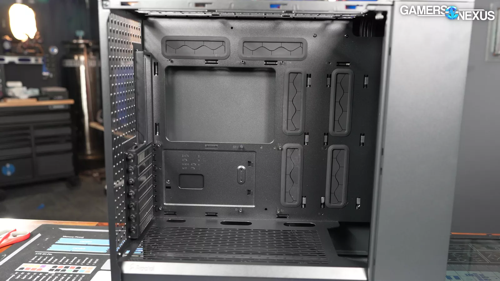 Fractal has a good track record for taking E-ATX support seriously and in a way that’s less likely to trigger another E-ATX rant from us. The North XL continues that trend with standoffs and cable cutouts to fit full 12"x13" SSI-EEB boards. In order to support the additional standoffs, the motherboard tray is entirely flat rather than having a cable channel at the front.