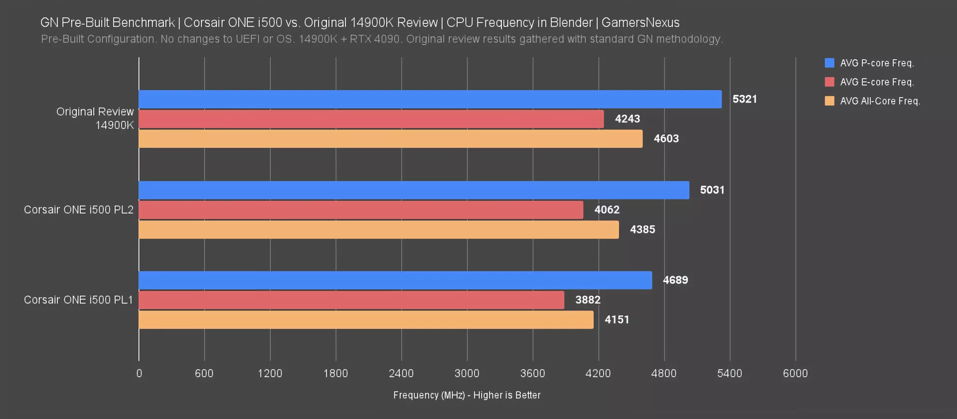 To look at CPU frequency, we’re comparing our original 14900K review data for an all-core 3D rendering workload in Blender against the Corsair build.